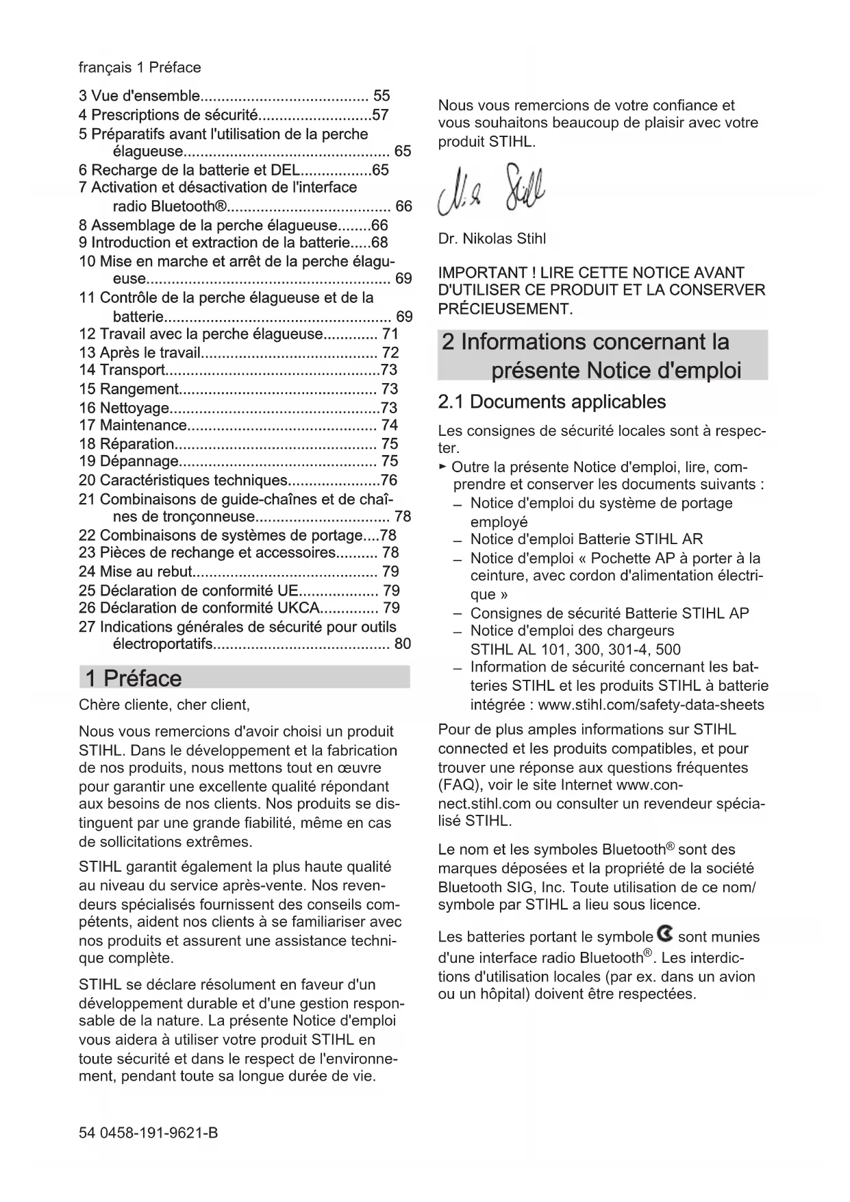 - 27 Indications générales de sécurité pour outils électroportatifs 1 Préface Chère cliente, cher client, Nous vous remercions d'avoir choisi un produit STIHL. Dans le développement et la fabrication de nos produits, nous mettons tout en œuvre pour garantir une excellente qualité répondant aux besoins de nos clients. Nos produits se dis‐ tinguent par une grande fiabilité, même en cas de sollicitations extrêmes. STIHL garantit également la plus haute qualité au niveau du service après-vente. Nos reven‐ deurs spécialisés fournissent des conseils com‐ pétents, aident nos clients à se familiariser avec nos produits et assurent une assistance techni‐ que complète. STIHL se déclare résolument en faveur d'un développement durable et d'une gestion respon‐ sable de la nature. La présente Notice d'emploi vous aidera à utiliser votre produit STIHL en toute sécurité et dans le respect de l'environne‐ ment, pendant toute sa longue durée de vie. Nous vous remercions de votre confiance et vous souhaitons beaucoup de plaisir avec votre produit STIHL. Dr. Nikolas Stihl p. 80