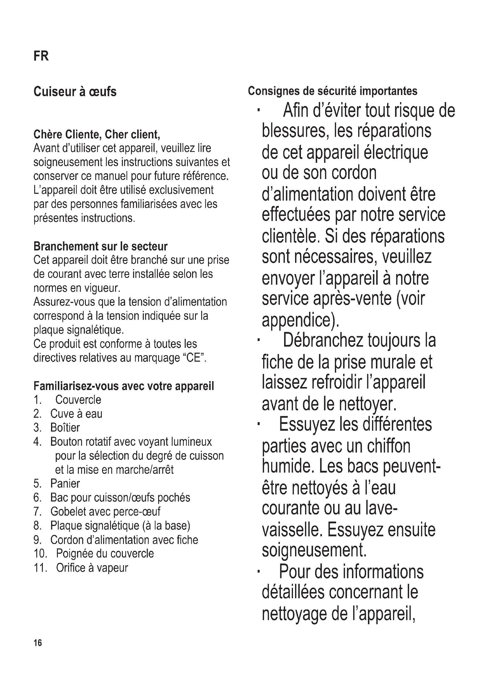 veuillez vous référer au paragraphe Nettoyage et entretien. ∙ Pour éviter le risque de choc électrique, ne pas nettoyer le cuiseur à œufs à l’eau et ne pas l’immerger. ∙ Cet appareil est destiné à une utilisation domestique ou similaire, telle que - dans les cuisines pour personnel, dans des bureaux et autres locaux commerciaux, - dans des organisations agricoles, - par la clientèle dans les hôtels, motels et hébergements similaires, - et dans des maisons d’hôtes. ∙ Faites attention en perçant les œufs avec le perce-œuf. ∙ Attention ! Les surfaces extérieures et la cuve à eau deviennent chaudes pendant l’utilisation et le restent ensuite pendant quelque temps. Tenez l’appareil uniquement par sa poignée. ∙ Attention ! De la vapeur chaude peut s’échapper du couvercle. ∙ Attention ! Une mauvaise utilisation de l’appareil peut entraîner des blessures. ∙ Cet appareil peut être utilisé par des enfants (à partir de 8 ans) et par des personnes souffrant de déciences physiques, sensorielles ou mentales, ou manquant d’expérience ou de connaissances, s’ils ont été formés à l’utilisation de l’appareil et ont été supervisés, et s’ils en comprennent les dangers et les précautions de18 104 x 142 mm sécurité à prendre. ∙ Les enfants ne doivent pas être autorisés à nettoyer ou entretenir l’appareil à moins d’être supervisés et d’avoir plus de 8 ans. ∙ L’appareil et son cordon d’alimentation doivent être, à tout moment, tenus hors de portée des enfants de moins de 8 ans. ∙ Attention : Tenez les enfants à l’écart des emballages, qui représentent un risque potentiel, par exemple, de suffocation. ∙ Avant toute utilisation, vériez soigneusement que l’appareil, son cordon d’alimentation et ses accessoires ne présentent aucun signe de détérioration qui pourrait avoir un effet néfaste sur la sécurité de fonctionnement de l’appareil. Au cas où l’appareil, par exemple, serait tombé sur une surface dure, ou si une force excessive aurait été employée pour tirer sur le cordon d’alimentation, il ne doit plus être utilisé. Dans ce cas, contactez notre Service Clientèle. ∙ Ne faites jamais fonctionner l’appareil sans surveillance. ∙ Ne mettez jamais le cordon d’alimentation en contact avec des surfaces chaudes et ne l’enroulez pas autour de l’appareil chaud. ∙ Débranchez toujours la che de la prise murale - en cas de fonctionnement défectueux, - après l’emploi, - avant de nettoyer l’appareil. ∙ Ne débranchez pas l’appareil en tirant sur le cordon ; prenez toujours la che en main. ∙ Quand il est en fonctionnement, l’appareil doit être placé sur une surface résistant à la chaleur et à l’eau. ∙ Ne placez pas l’appareil sur ou à proximité de surfaces brûlantes ou de ammes telles que les plaques chauffantes ou brûleurs à gaz. Ne faites pas fonctionner l’appareil sous des objets ou meubles fragiles tels que des placards car de la vapeur brûlante s’échappe du couvercle durant la cuisson. ∙ Nous déclinons toute responsabilité pour les dommages éventuels subis par cet appareil, résultant d’une utilisation incorrecte ou du non-respect de ce mode d’emploi. Avant la première mise en service ∙ Déballez l’appareil et retirez tous les emballages et les autocollants publicitaires éventuels de l’appareil. Ne retirez pas la plaque signalétique. ∙ Faire fonctionner l’appareil une fois avec le panier, mais sans y mettre d’œufs, sur le réglage /mi-cuit tel que décrit dans Utilisation. ∙ Nettoyez le bac pour cuisson/œufs pochés à l’eau courante et séchez-le.104 x 142 mm