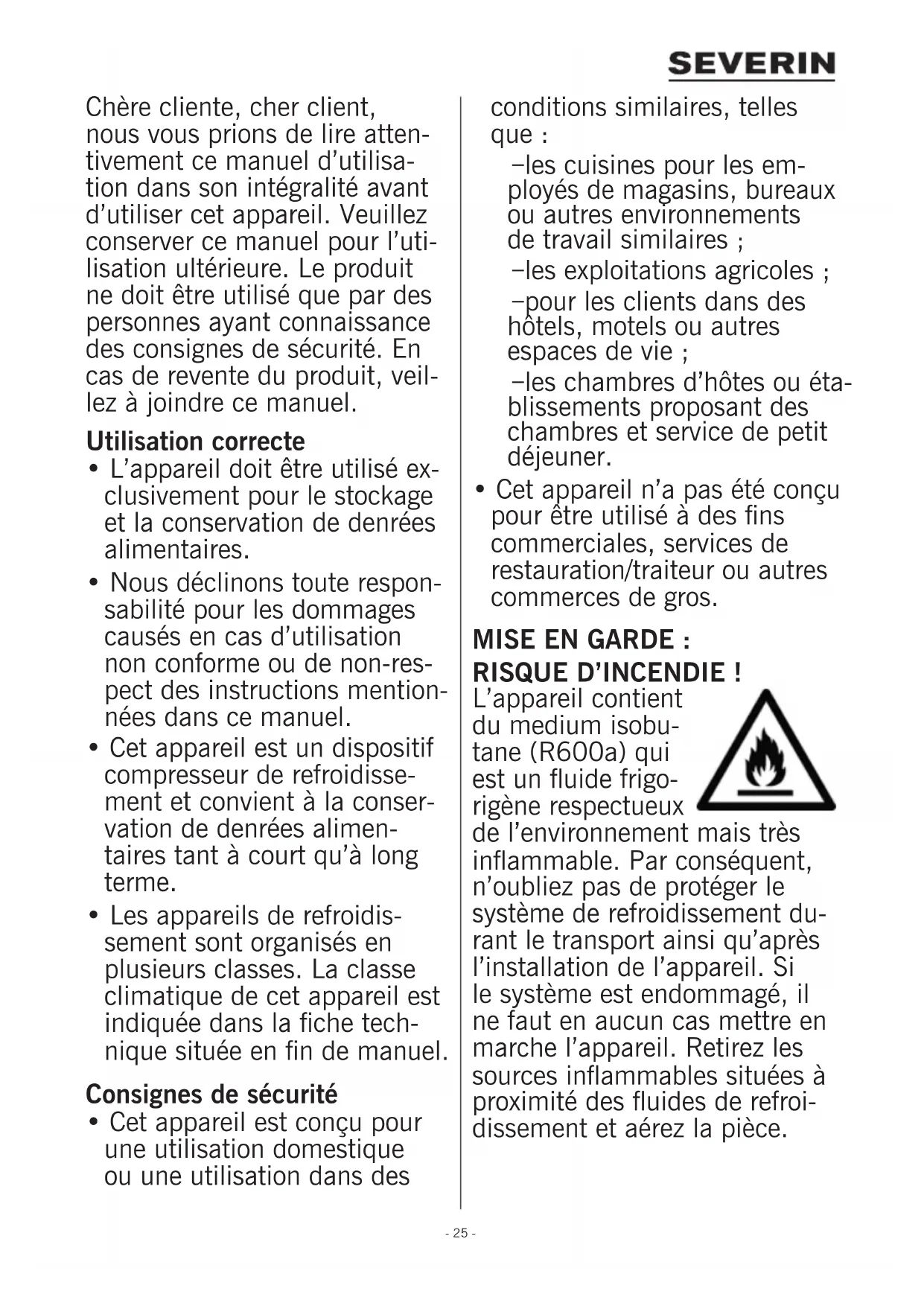 - Cet appareil n’a pas été conçu pour être utilisé à des ns commerciales, services de restauration/traiteur ou autres commerces de gros. MISE EN GARDE : RISQUE D’INCENDIE ! L’appareil contient du medium isobu- tane (R600a) qui est un uide frigo- rigène respectueux de l’environnement mais très inammable. Par conséquent, n’oubliez pas de protéger le système de refroidissement du- rant le transport ainsi qu’après l’installation de l’appareil. Si le système est endommagé, il ne faut en aucun cas mettre en marche l’appareil. Retirez les sources inammables situées à proximité des uides de refroi- dissement et aérez la pièce.- 26 -