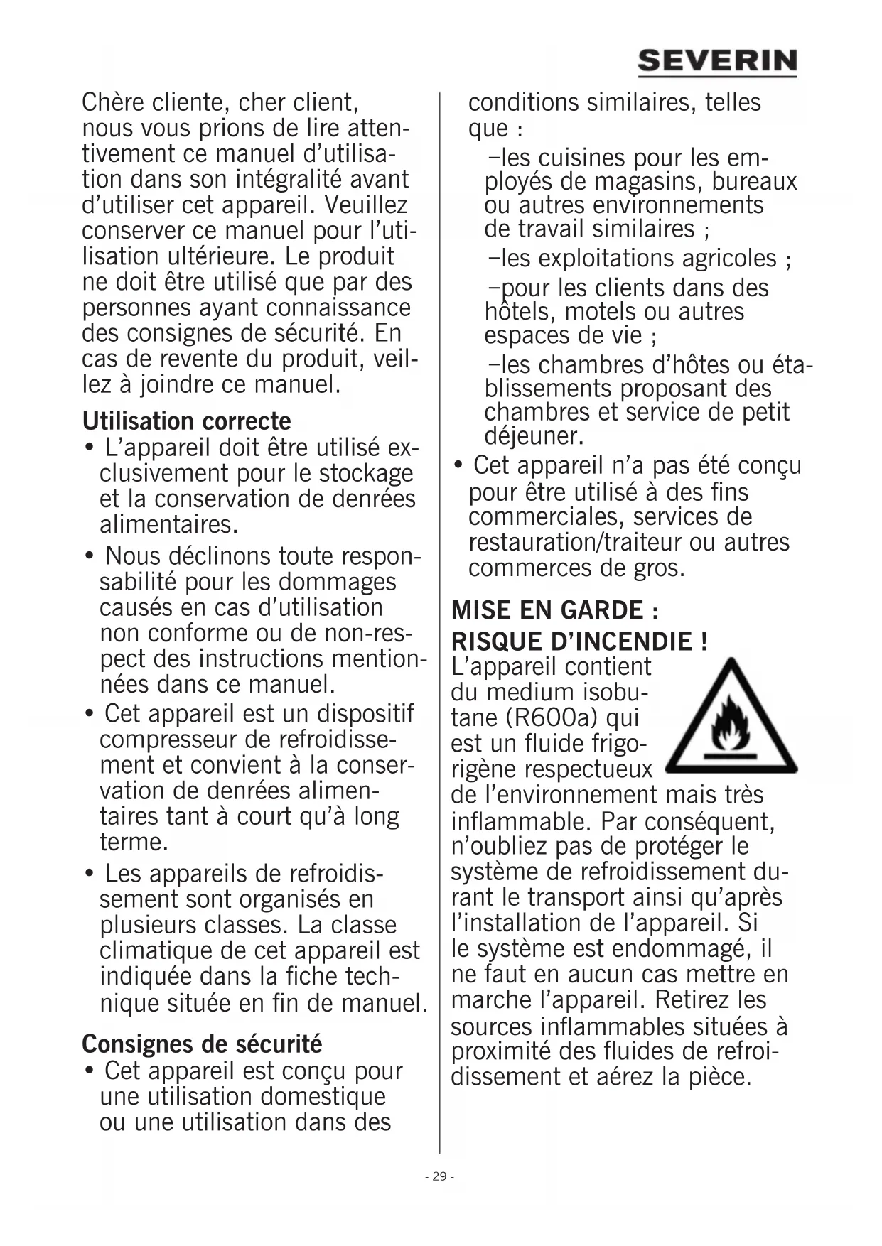 - Cet appareil n’a pas été conçu pour être utilisé à des ns commerciales, services de restauration/traiteur ou autres commerces de gros. MISE EN GARDE : RISQUE D’INCENDIE ! L’appareil contient du medium isobu- tane (R600a) qui est un uide frigo- rigène respectueux de l’environnement mais très inammable. Par conséquent, n’oubliez pas de protéger le système de refroidissement du- rant le transport ainsi qu’après l’installation de l’appareil. Si le système est endommagé, il ne faut en aucun cas mettre en marche l’appareil. Retirez les sources inammables situées à proximité des uides de refroi- dissement et aérez la pièce.- 30 -