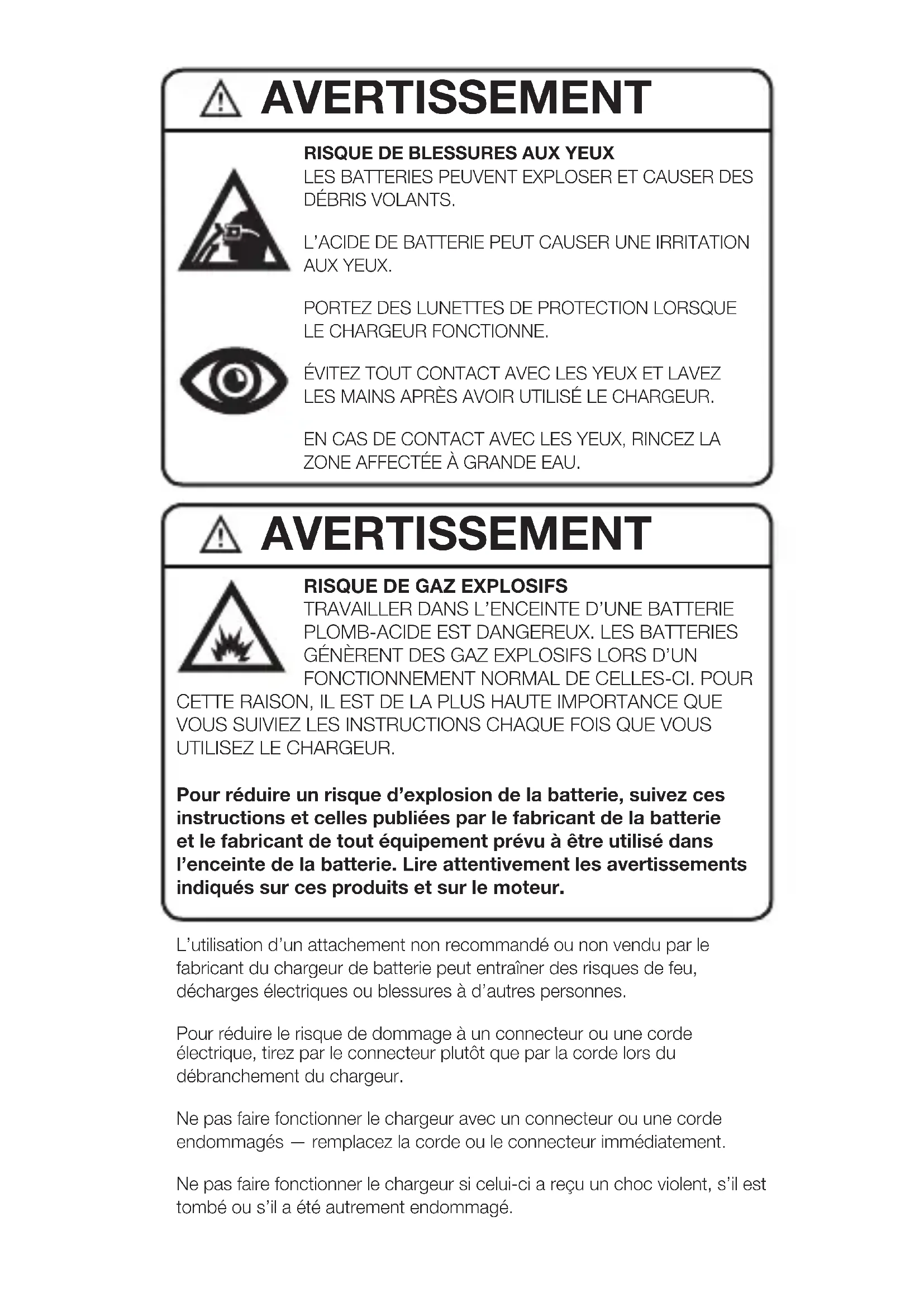 - Ce chargeur de batterie est pour charger les BATTERIES PLOMB- ACIDE SEULEMENT. N’UTILISEZ PAS LE CHARGEUR DE BATTERIE POUR DES BATTERIES À PILES SÈCHES COMMUNÉMENT UTILISÉES POUR LES APPAREILS ÉLECTROMÉNAGERS. CES TYPES DE BATTERIES PEUVENT ÉCLATER ET CAUSER DES DOMMAGES À LA PROPRIÉTÉ, DES BLESSURES PERSONNELLES OU LA MORT.