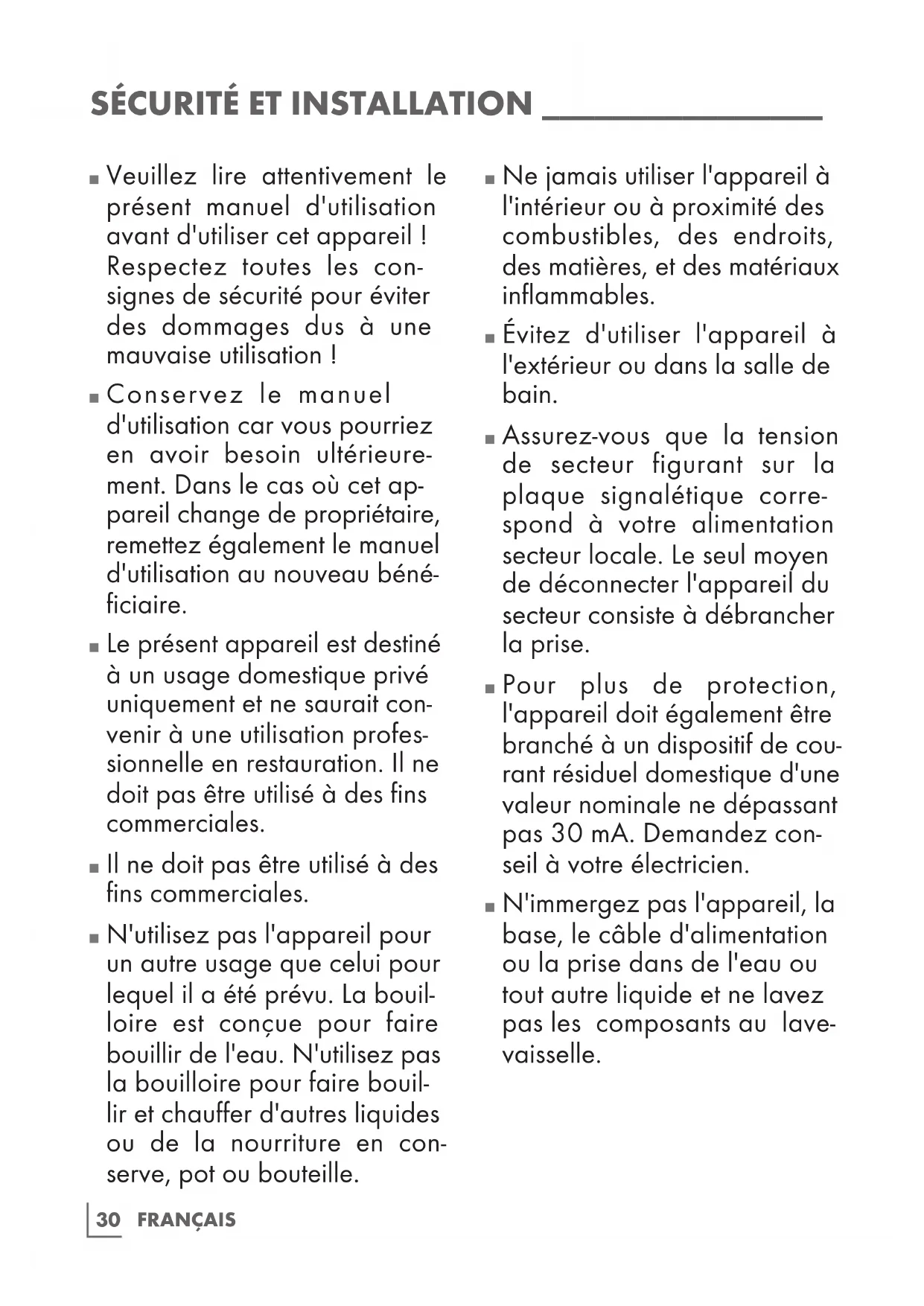 N'utilisez pas l'appareil pour un autre usage que celui pour lequel il a été prévu. La bouil- loire est conçue pour faire bouillir de l'eau. N'utilisez pas la bouilloire pour faire bouil- lir et chauffer d'autres liquides ou de la nourriture en con- serve, pot ou bouteille.