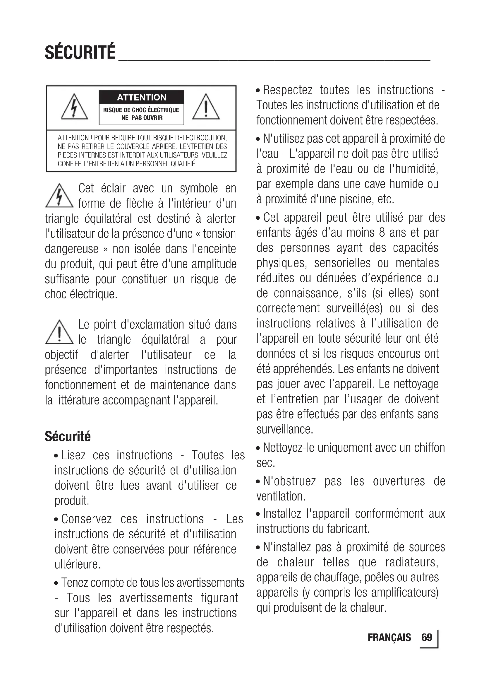 - N'installez pas à proximité de sources de chaleur telles que radiateurs, appareils de chauffage, poêles ou autres appareils (y compris les amplificateurs) qui produisent de la chaleur. ATTENTION ATTENTION! POUR REDUIRE TOUT RISQUE DELECTROCUTION, NE PAS RETIRER LE COUVERCLE ARRIERE. LENTRETIEN DES PIECES INTERNES EST INTERDIT AUX UTILISATEURS. VEUILLEZ CONFIER L’ENTRETIEN A UN PERSONNEL QUALIFIÉ.RISQUE DE CHOC ÉLECTRIQUE NE PAS OUVRIR70 FRANÇAIS SÉCURITÉ __________________________________