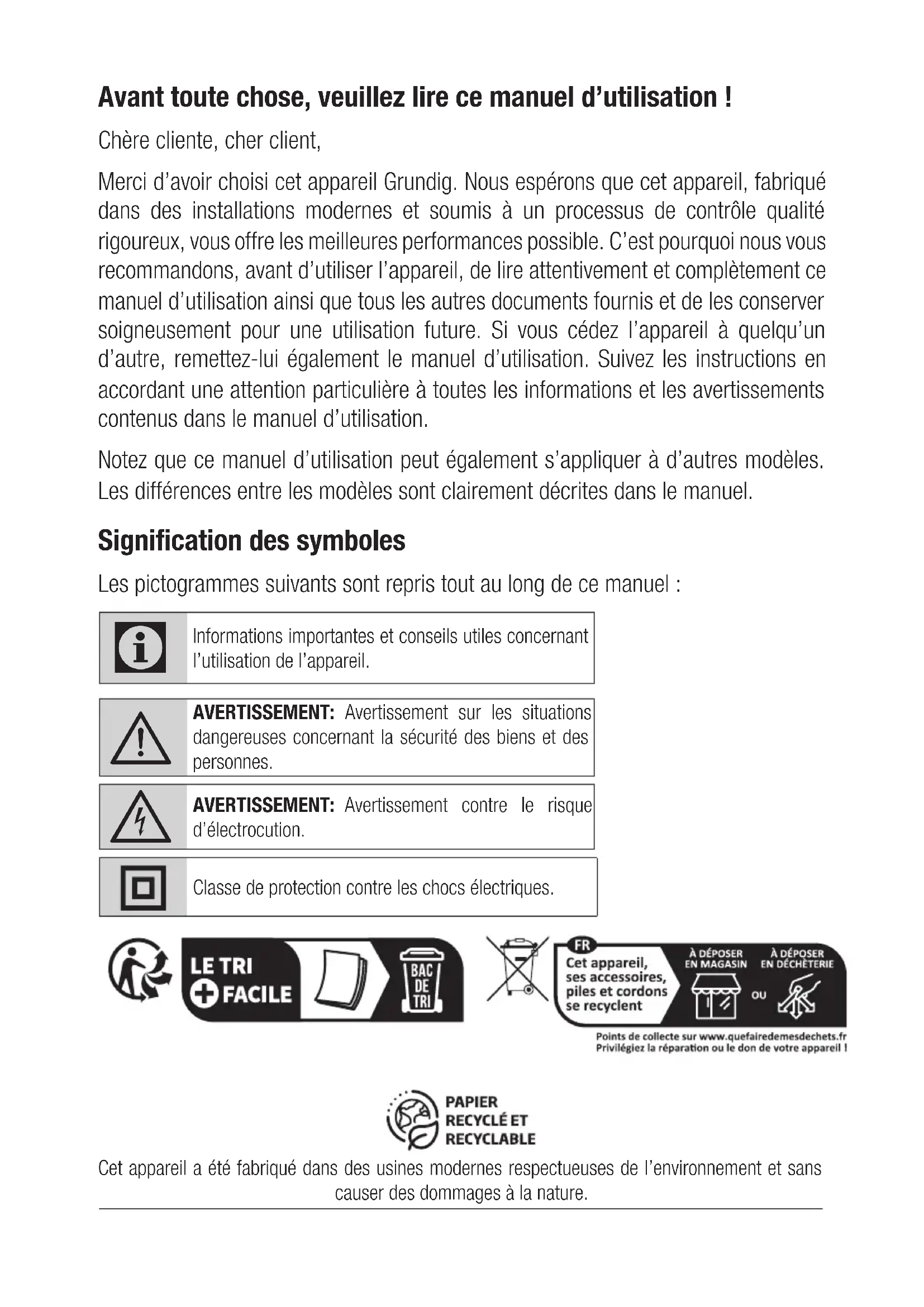 d’électrocution. Classe de protection contre les chocs électriques. Cet appareil a été fabriqué dans des usines modernes respectueuses de l’environnement et sans causer des dommages à la nature.40 FRANÇAIS Les instructions d'utilisation et les consignes de sécurité doi- vent être conservées pour une consultation ultérieure.