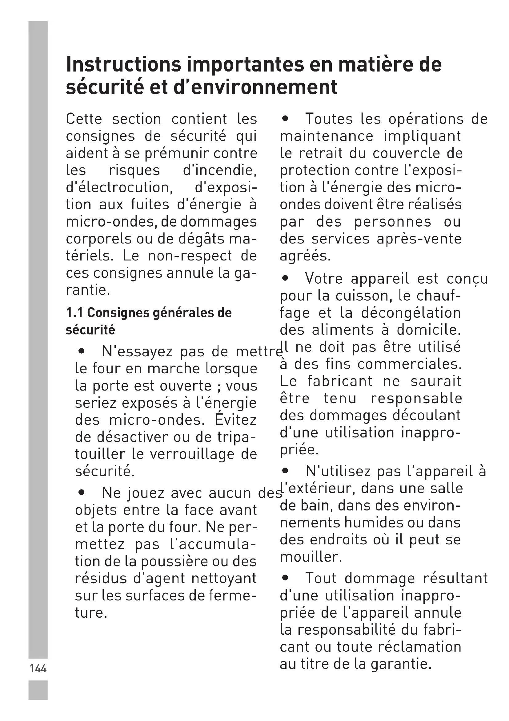- Ne mettez pas l'appareil en marche lorsqu'il est vide. Instructions importantes en matière de sécurité et d’environnement146