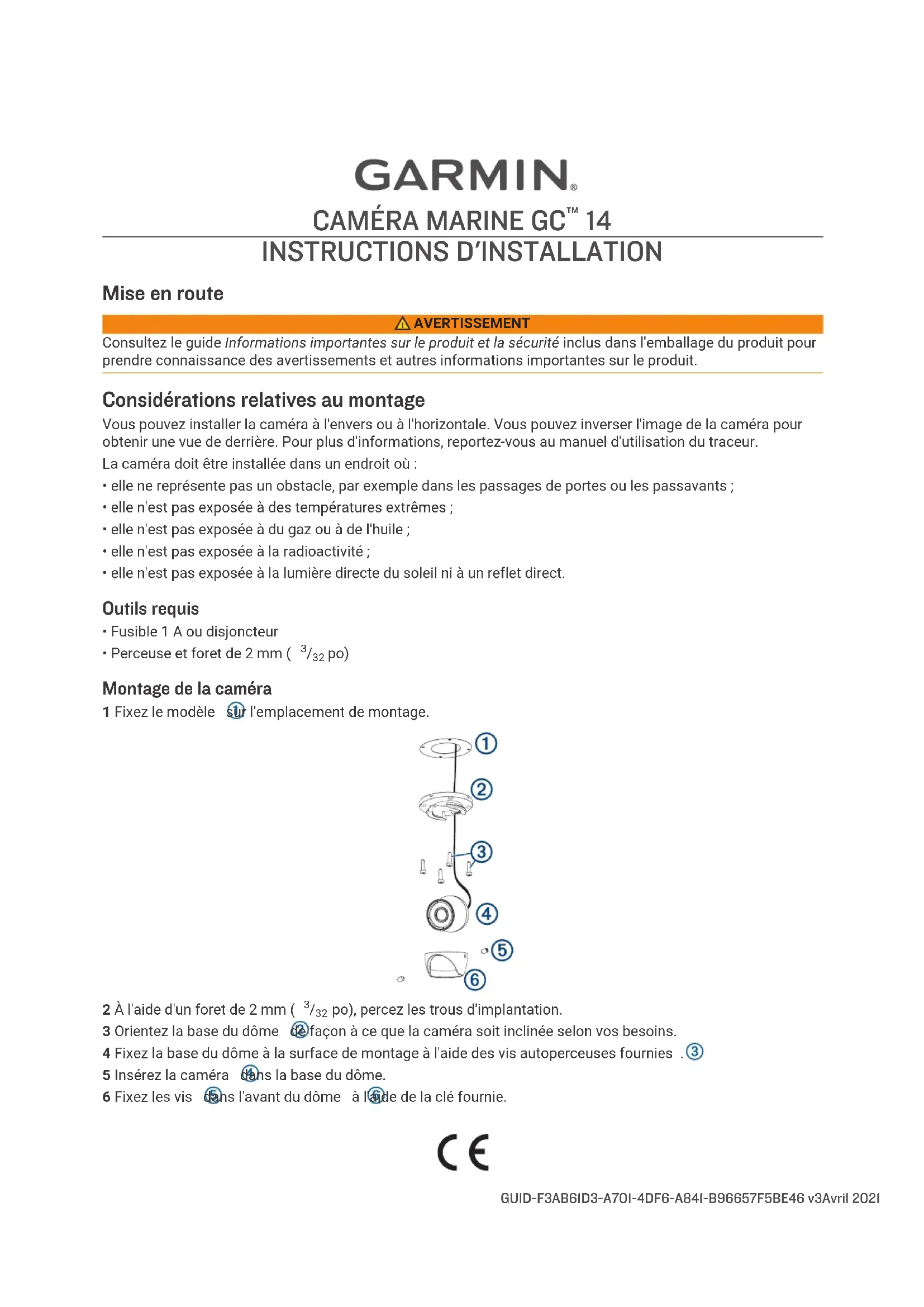 po), percez les trous d'implantation. 3 Orientez la base du dôme de façon à ce que la caméra soit inclinée selon vos besoins. 4 Fixez la base du dôme à la surface de montage à l'aide des vis autoperceuses fournies . 5 Insérez la caméra dans la base du dôme. 6 Fixez les vis dans l'avant du dôme à l'aide de la clé fournie. GUID-F3AB61D3-A701-4DF6-A841-B96657F5BE46 v3Avril 2021Considérations relatives à l'installation Vous devez connecter le fil d'alimentation de la caméra à la batterie en utilisant un fusible 1 A ou un disjoncteur. Si vous omettez un fusible ou un disjoncteur, la caméra ne fonctionnera pas correctement. Certains traceurs Garmin