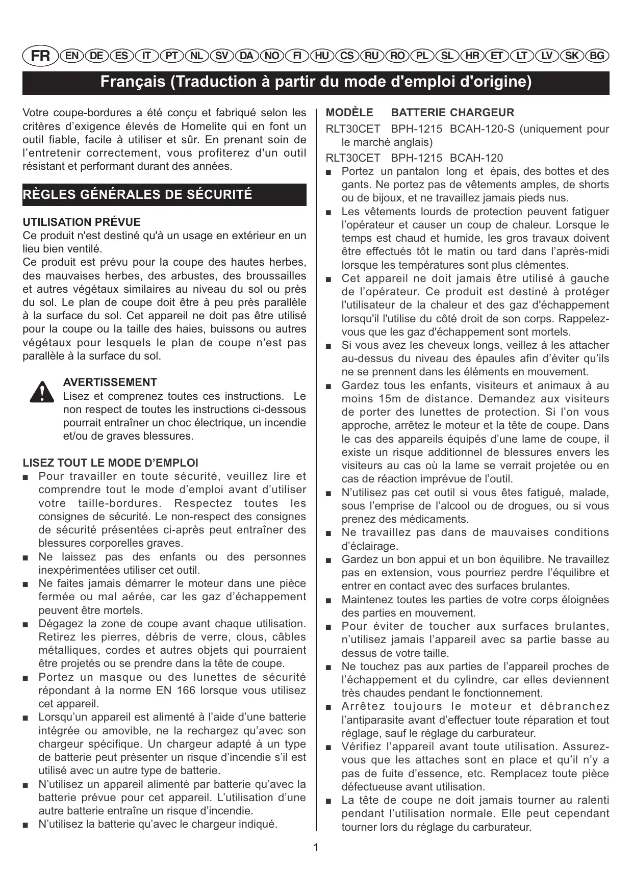 Pour travailler en toute sécurité, veuillez lire et comprendre tout le mode d'emploi avant d'utiliser votre taille-bordures. Respectez toutes les consignes de sécurité. Le non-respect des consignes de sécurité représentées ci-après peut entraîner des blessures corporelles graves.