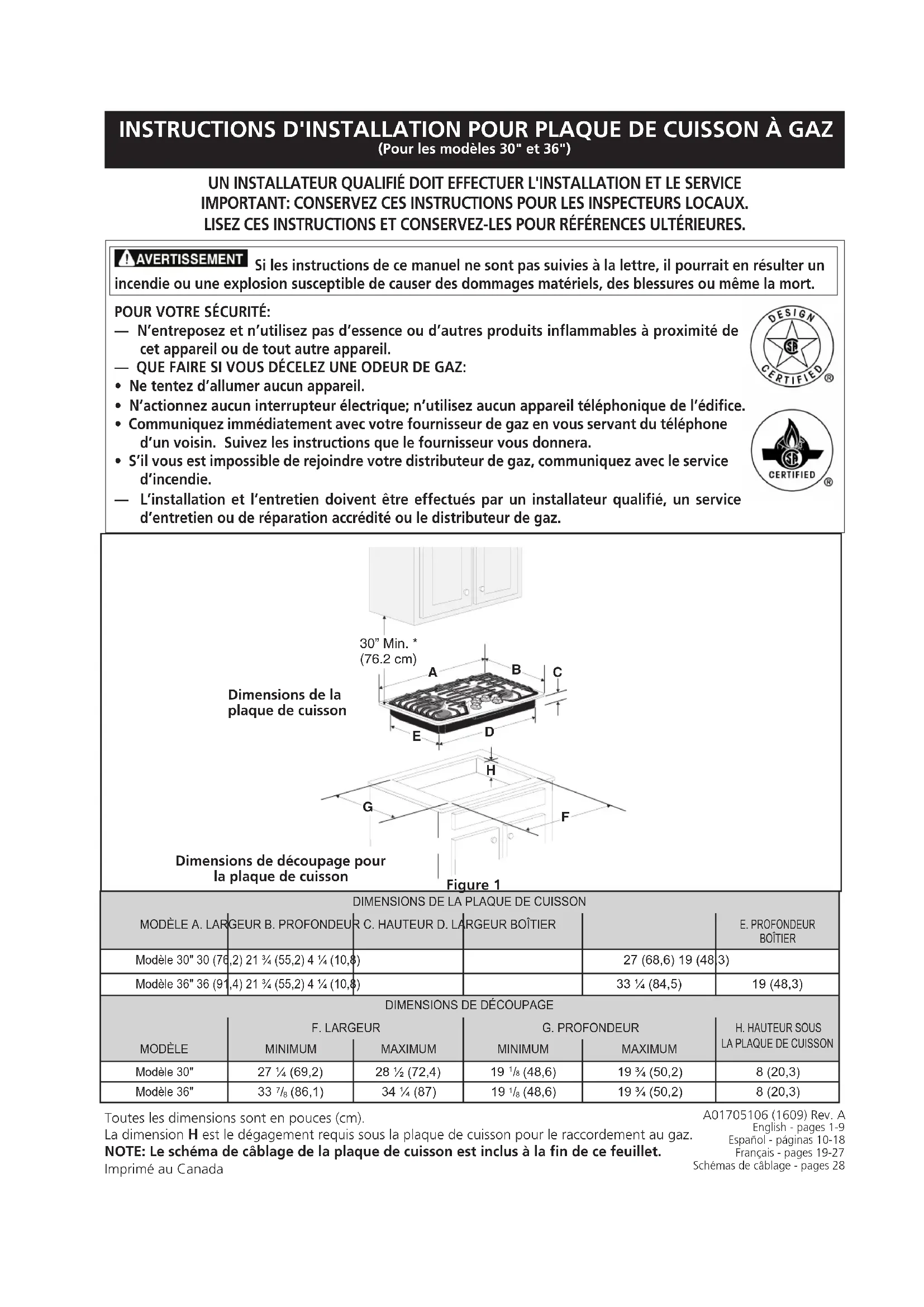 UN INSTALLATEUR QUALIFIÉ DOIT EFFECTUER L'INSTALLATION ET LE SERVICE IMPORTANT: CONSERVEZ CES INSTRUCTIONS POUR LES INSPECTEURS LOCAUX. LISEZ CES INSTRUCTIONS ET CONSERVEZ-LES POUR RÉFÉRENCES ULTÉRIEURES. Toutes les dimensions sont en pouces (cm). La dimension H est le dégagement requis sous la plaque de cuisson pour le raccordement au gaz. NOTE: Le schéma de câblage de la plaque de cuisson est inclus à la fin de ce feuillet. Imprimé au Canada Si les instructions de ce manuel ne sont pas suivies à la lettre, il pourrait en résulter un incendie ou une explosion susceptible de causer des dommages matériels, des blessures ou même la mort. POUR VOTRE SÉCURITÉ: — N’entreposez et n’utilisez pas d’essence ou d’autres produits inflammables à proximité de cet appareil ou de tout autre appareil. — QUE FAIRE SI VOUS DÉCELEZ UNE ODEUR DE GAZ: