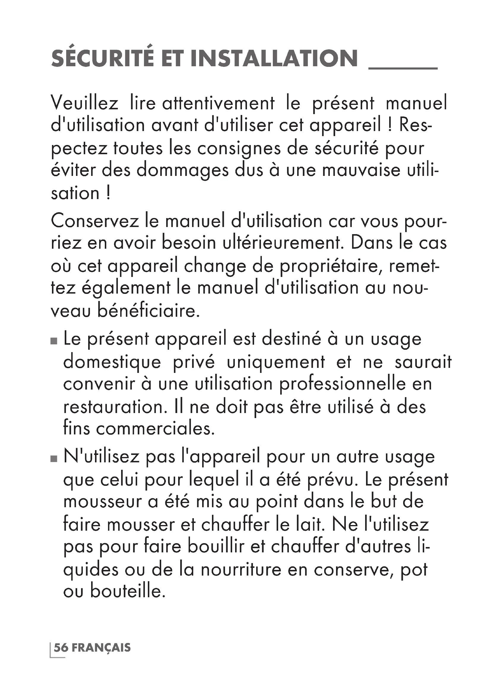 N'utilisez pas l'appareil pour un autre usage que celui pour lequel il a été prévu. Le présent mousseur a été mis au point dans le but de faire mousser et chauffer le lait. Ne l'utilisez pas pour faire bouillir et chauffer d'autres li- quides ou de la nourriture en conserve, pot ou bouteille.57FRANÇAIS