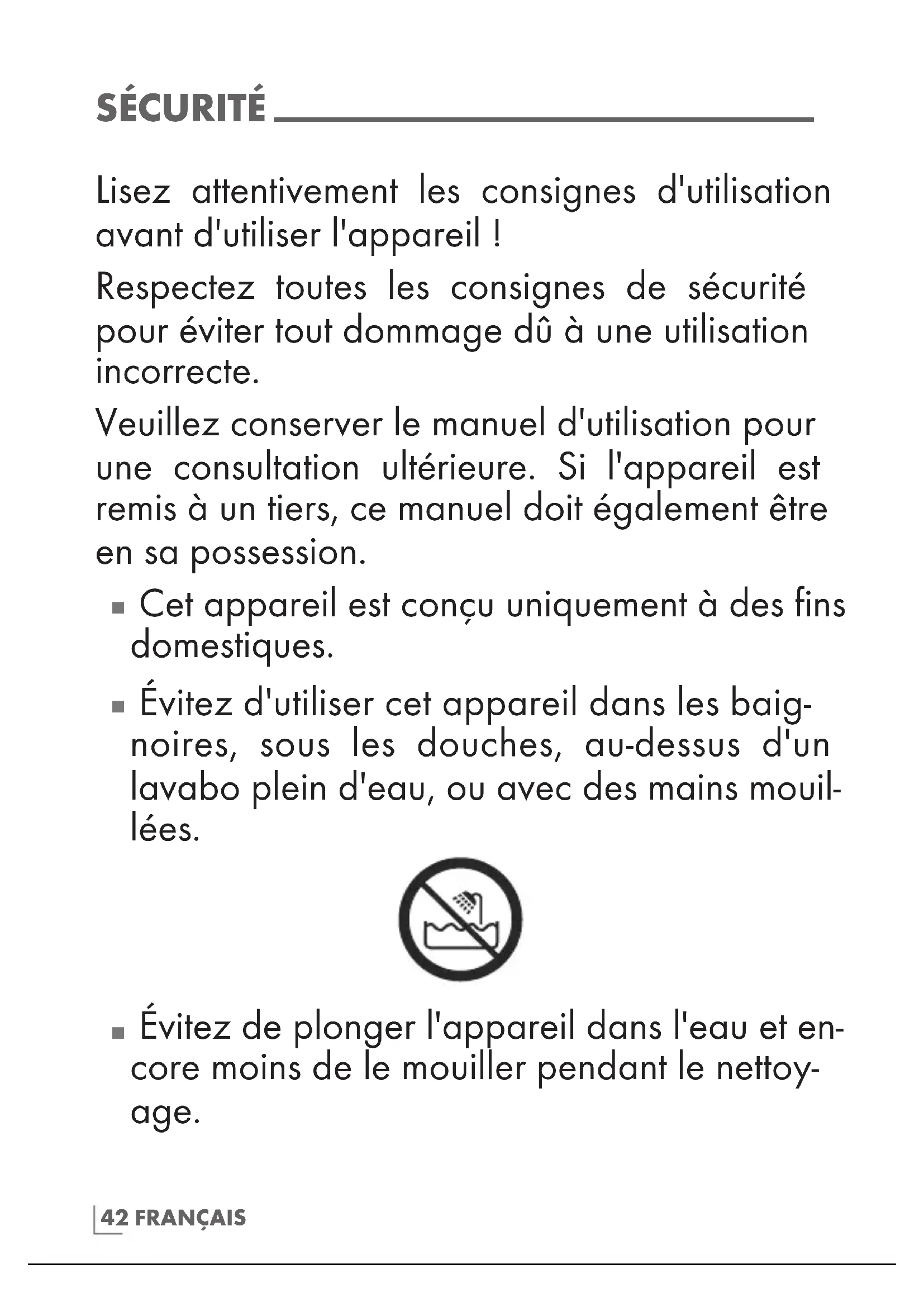 Évitez d'utiliser cet appareil dans les baig- noires, sous les douches, au-dessus d'un lavabo plein d'eau, ou avec des mains mouil- lées.