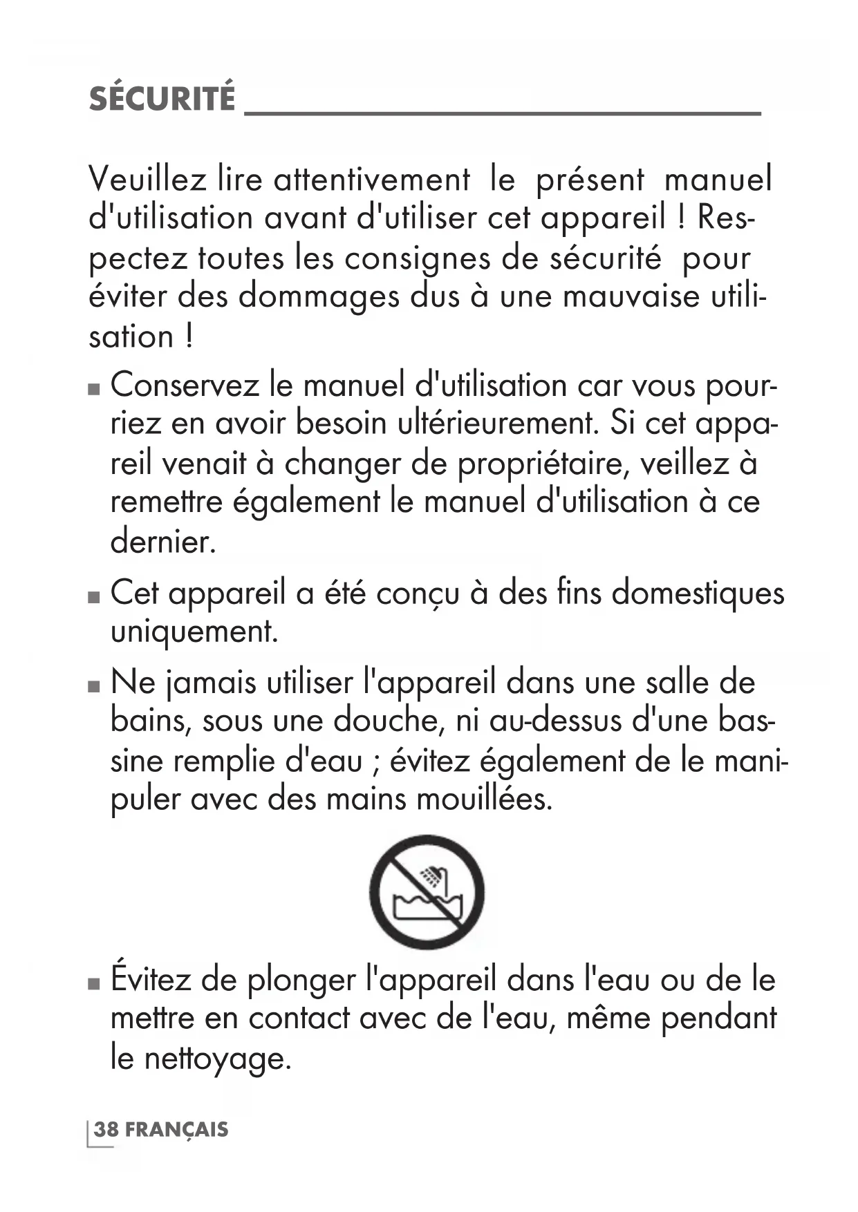 Évitez de plonger l'appareil dans l'eau ou de le mettre en contact avec de l'eau, même pendant le nettoyage.39FRANÇAIS SÉCURITÉ ______________________________