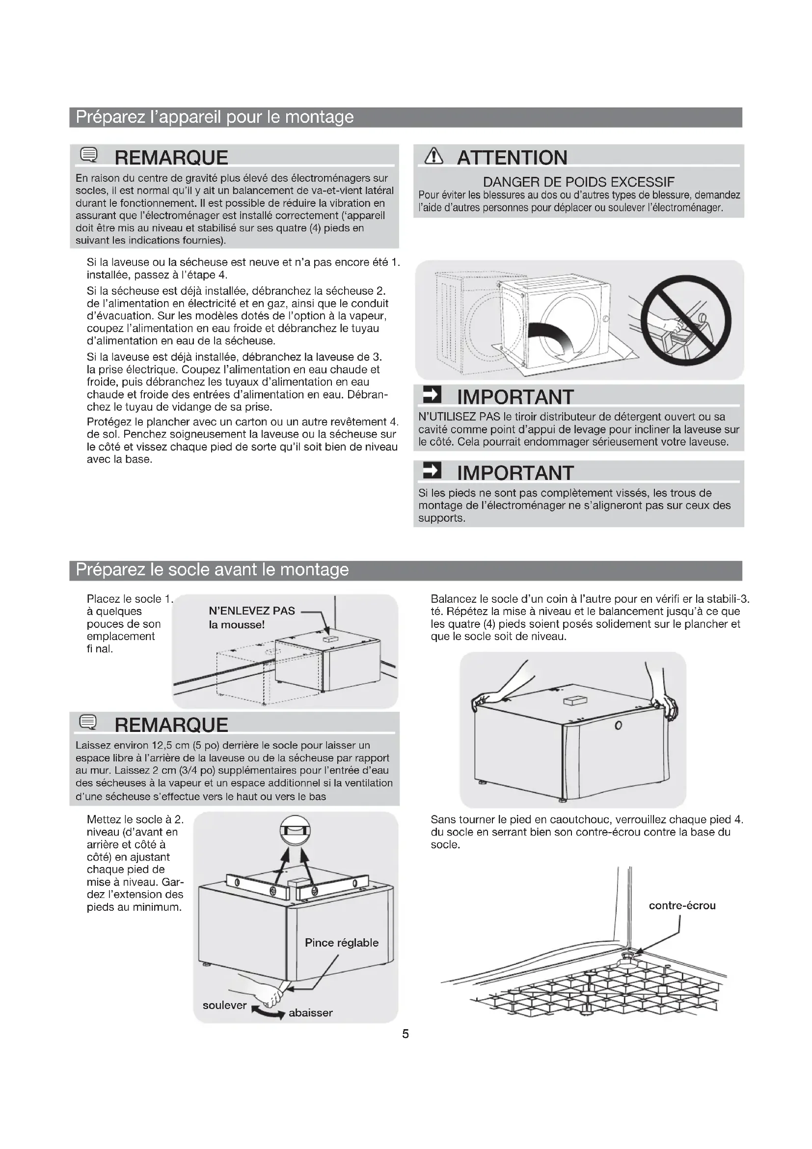 la mousse! IMPORTANT N’UTILISEZ PAS le tiroir distributeur de détergent ouvert ou sa cavité comme point d’appui de levage pour incliner la laveuse sur le côté. Cela pourrait endommager sérieusement votre laveuse. IMPORTANT Si les pieds ne sont pas complètement vissés, les trous de montage de l’électroménager ne s’aligneront pas sur ceux des supports. contre-écrou Pince réglable abaisser soulever REMARQUE En raison du centre de gravité plus élevé des électroménagers sur socles, il est normal qu’il y ait un balancement de va-et-vient latéral durant le fonctionnement. Il est possible de réduire la vibration en assurant que l’électroménager est installé correctement (‘appareil doit être mis au niveau et stabilisé sur ses quatre (4) pieds en suivant les indications fournies). ATTENTION
