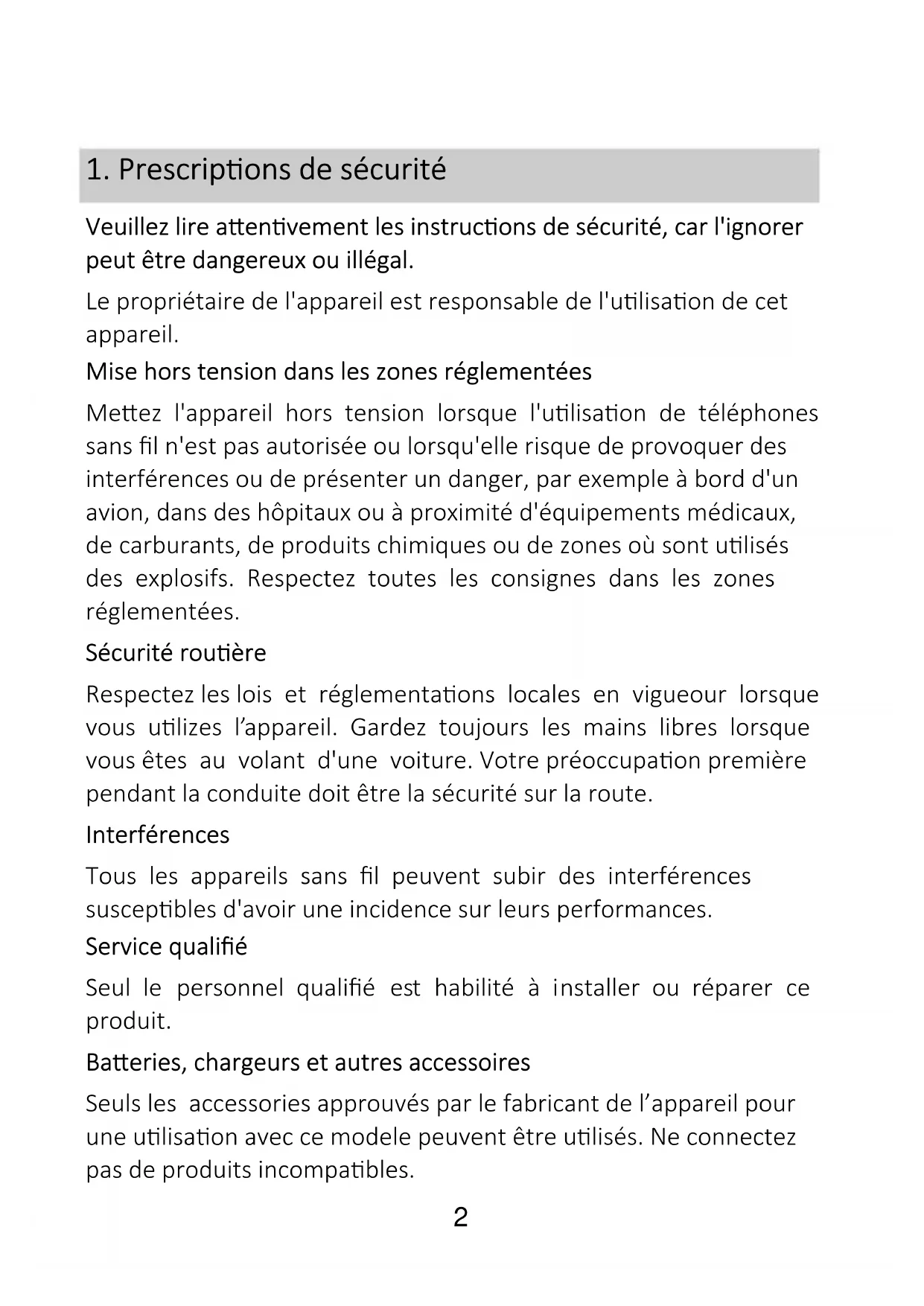 Veuillez lire attentivement les instructions de sécurité, car l'ignorer peut être dangereux ou illégal. Le propriétaire de l'appareil est responsable de l'utilisation de cet appareil. Mise hors tension dans les zones réglementées Mettez l'appareil hors tension lorsque l'utilisation de téléphones sans fil n'est pas autorisée ou lorsqu'elle risque de provoquer des interférences ou de présenter un danger, par exemple à bord d'un avion, dans des hôpitaux ou à proximité d'équipements médicaux, de carburants, de produits chimiques ou de zones où sont utilisés des explosifs. Respectez toutes les consignes dans les zones réglementées. Sécurité routière Respectez les lois et réglementations locales en vigueour lorsque vous utilizes l’appareil. Gardez toujours les mains libres lorsque vous êtes au volant d'une voiture. Votre préoccupation première pendant la conduite doit être la sécurité sur la route. Interférences Tous les appareils sans fil peuvent subir des interférences susceptibles d'avoir une incidence sur leurs performances. Service qualifié Seul le personnel qualifié est habilité à installer ou réparer ce produit. Batteries, chargeurs et autres accessoires Seuls les accessories approuvés par le fabricant de l’appareil pour une utilisation avec ce modele peuvent être utilisés. Ne connectez pas de produits incompatibles.3 Résistance à l'eau Votre appareil n'est pas étanche. Maintenez-le au sec. Protection de l’audition Pour prévenir tout risque de lésions auditives, évitez d’écouter á volume élevé pendant de longues périodes. Environnement de l’utilisation Cet appareil est conforme aux directives en matière d'exposition aux fréquences radioélectriques lorsqu'il est utilisé soit dans sa position normale contre l'oreille. Lorsque vous transportez le téléphone dans un étui, un clip ceinture ou un support, assurez-vous qu'il ne contient pas de métal et que le téléphone est légèrement distrait du corps. Lors de l'utilisation d'autres accessoires, il n'est pas possible de fonctionner avec des directives de radiofréquence. Si vous n'utilisez pas d'étui et ne tenez pas le téléphone contre votre oreille, gardez-le à au moins 2,5 cm de votre corps, surtout pendant le transfert de données.