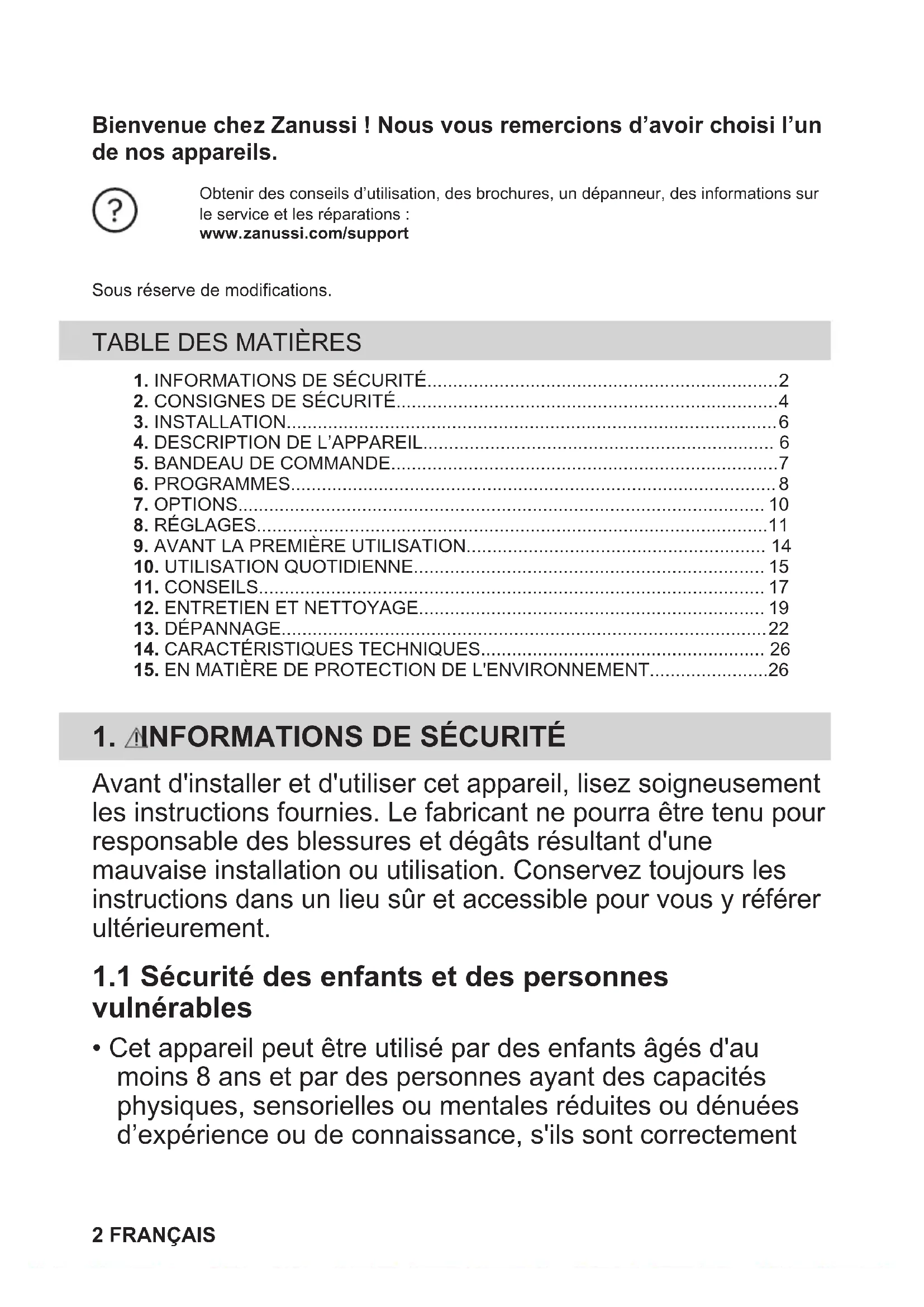 Recyclez les matériaux portant le symbole . Déposez les emballages dans les conteneurs prévus à cet effet. Contribuez à la protection de l'environnement et à votre sécurité, recyclez vos produits électriques et électroniques. Ne jetez pas les appareils portant le symbole avec les ordures ménagères. Emmenez un tel produit dans votre centre local de recyclage ou contactez vos services municipaux. Concerne la France uniquement : 26 FRANÇAISWillkommen bei Zanussi! Danke, dass Sie sich für unser Gerät entschieden haben. Holen Sie sich Anwendungshinweise, Prospekte, Fehlerbehebungs-, Service- undReparatur-Informationen unter zanussi.com/supportÄnderungen vorbehalten. INHALTSVERZEICHNIS