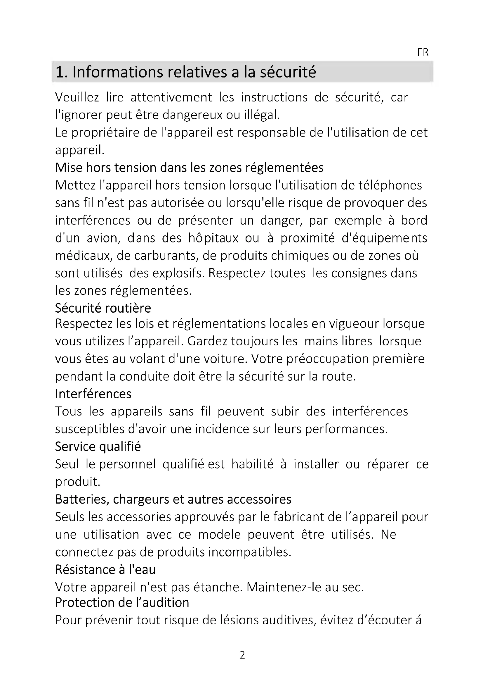 Veuillez lire attentivement les instructions de sécurité, car l'ignorer peut être dangereux ou illégal. Le propriétaire de l'appareil est responsable de l'utilisation de cet appareil. Mise hors tension dans les zones réglementées Mettez l'appareil hors tension lorsque l'utilisation de téléphones sans fil n'est pas autorisée ou lorsqu'elle risque de provoquer des interférences ou de présenter un danger, par exemple à bord d'un avion, dans des hôpitaux ou à proximité d'équipements médicaux, de carburants, de produits chimiques ou de zones où sont utilisés des explosifs. Respectez toutes les consignes dans les zones réglementées. Sécurité routière Respectez les lois et réglementations locales en vigueour lorsque vous utilizes l’appareil. Gardez toujours les mains libres lorsque vous êtes au volant d'une voiture. Votre préoccupation première pendant la conduite doit être la sécurité sur la route. Interférences Tous les appareils sans fil peuvent subir des interférences susceptibles d'avoir une incidence sur leurs performances. Service qualifié Seul le personnel qualifié est habilité à installer ou réparer ce produit. Batteries, chargeurs et autres accessoires Seuls les accessories approuvés par le fabricant de l’appareil pour une utilisation avec ce modele peuvent être utilisés. Ne connectez pas de produits incompatibles. Résistance à l'eau Votre appareil n'est pas étanche. Maintenez-le au sec. Protection de l’audition Pour prévenir tout risque de lésions auditives, évitez d’écouter áFR