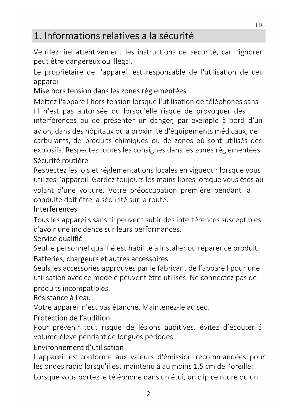 Veuillez lire attentivement les instructions de sécurité, car l'ignorer peut être dangereux ou illégal. Le propriétaire de l'appareil est responsable de l'utilisation de cet appareil. Mise hors tension dans les zones réglementées Mettez l'appareil hors tension lorsque l'utilisation de téléphones sans fil n'est pas autorisée ou lorsqu'elle risque de provoquer des interférences ou de présenter un danger, par exemple à bord d'un avion, dans des hôpitaux ou à proximité d'équipements médicaux, de carburants, de produits chimiques ou de zones où sont utilisés des explosifs. Respectez toutes les consignes dans les zones réglementées. Sécurité routière Respectez les lois et réglementations locales en vigueour lorsque vous utilizes l’appareil. Gardez toujours les mains libres lorsque vous êtes au volant d'une voiture. Votre préoccupation première pendant la conduite doit être la sécurité sur la route. Interférences Tous les appareils sans fil peuvent subir des interférences susceptibles d'avoir une incidence sur leurs performances. Service qualifié Seul le personnel qualifié est habilité à installer ou réparer ce produit. Batteries, chargeurs et autres accessoires Seuls les accessories approuvés par le fabricant de l’appareil pour une utilisation avec ce modele peuvent être utilisés. Ne connectez pas de produits incompatibles. Résistance à l'eau Votre appareil n'est pas étanche. Maintenez-le au sec. Protection de l’audition Pour prévenir tout risque de lésions auditives, évitez d’écouter á volume élevé pendant de longues périodes. Environnement d’utilisation L'appareil est conforme aux valeurs d'émission recommandées pour les ondes radio lorsqu'il est maintenu à au moins 1,5 cm de l’oreille. Lorsque vous portez le téléphone dans un étui, un clip ceinture ou unFR