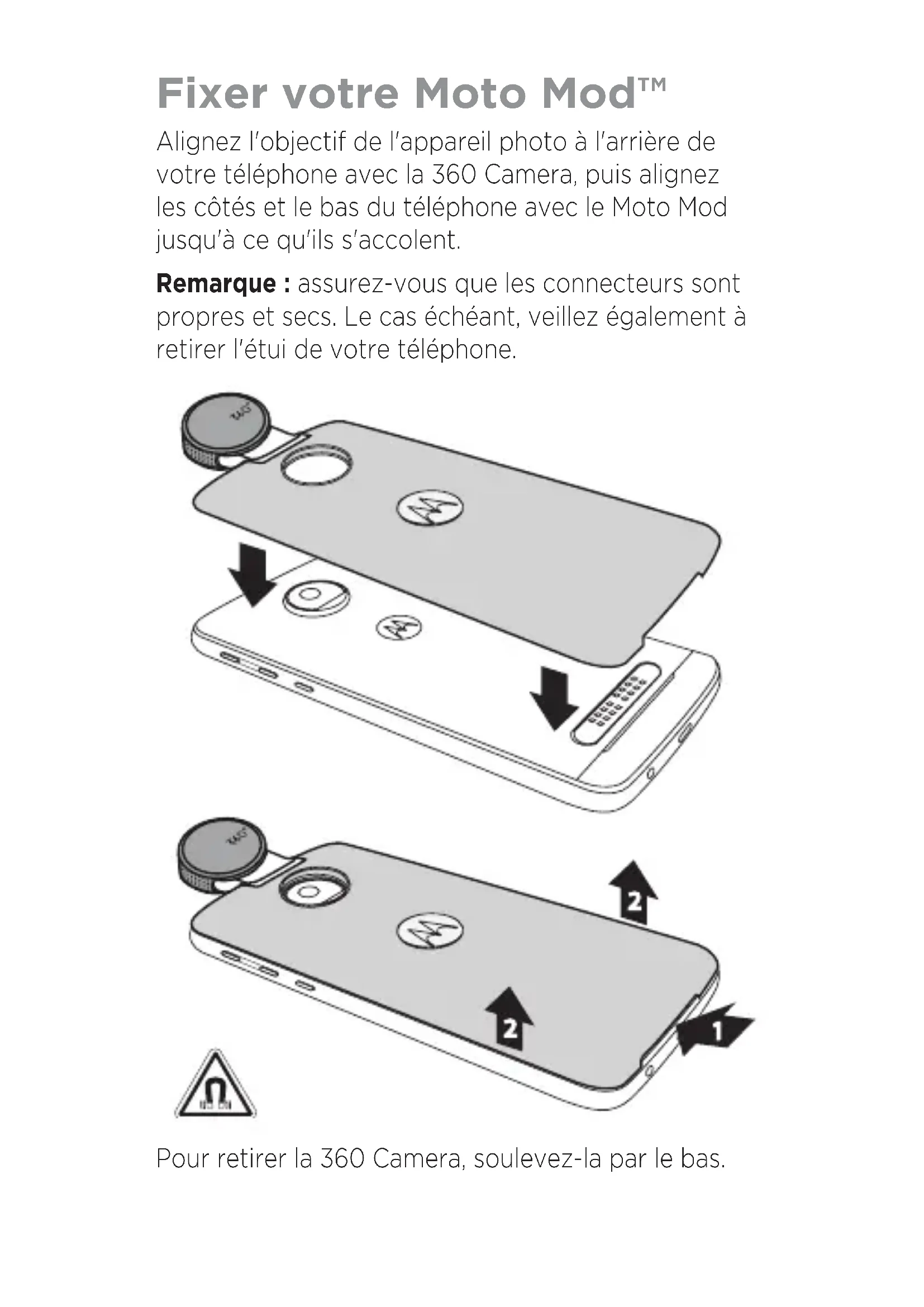 - Modifier: ouvrez une image et appuyez sur , ou ouvrez une vidéo et appuyez sur . Les options de modification se trouvent en bas.Options de modification des photos à 360° Pour accéder à ces options, appuyez sur . Rogner Rognez une photo à 360° pour obtenir une photo de taille standard. Choisissez entre les tailles standard ou personnalisez les dimensions, y compris l'eet rond. Rognage 360° Rognez une photo à 360° pour obtenir une photo immersive à 360° de la zone de votre choix. Filtres Choisissez parmi un large éventail de filtres. Ajustement Ajustez manuellement l'exposition, le contraste, la saturation et la teinte.Options de modification des vidéos à 360° Pour accéder à ces options, appuyez sur . Couper Coupez la longueur de votre vidéo. Compiler Compilez plusieurs vidéos à 360° en une seule. Director's Cut Choisissez les parties les plus intéressantes d'une vidéo à 360° et éditez-les ensemble pour en faire une vidéo normale et non interactive, au format 16:9, visible par tous. Capturer Transformez une image de la vidéo en photo, à 360° ou à plat. Vous voulez en savoir plus ? Accédez à www.motorola.com/mymotomods pour obtenir des didacticiels, des vidéos et plus encore.Droits d'auteur et marques commerciales Motorola Mobility LLC 222W. Merchandise Mart Plaza Chicago, IL 60654 www.motorola.com Certains services, fonctionnalités et applications dépendent du réseau et peuvent ne pas être disponibles partout; des termes, conditions et/ou tarifs particuliers pourront être appliqués. Pour plus de détails, adressez-vous à votre opérateur. Les fonctions, fonctionnalités, caractéristiques du produit et informations indiquées dans ce guide d'utilisation sont mises à jour et étaient exactes au moment de la mise sous presse. Motorola se réserve le droit de modifier ces informations sans préavis, ni obligation. Remarque: les images de ce guide sont fournies à titre d'exemple uniquement. MOTOROLA, le logoM stylisé, MOTO et l'ensemble des marques MOTO sont des marques commerciales ou marques déposées de Motorola Trademark Holdings, LLC. LENOVO est une marque commerciale de Lenovo. Google Android, Google Play et les autres marques sont des marques commerciales de Google Inc. Le logo microSD est une marque commerciale de SD-3C, LLC. Les autres noms de produits et de services appartiennent à leurs propriétaires respectifs. © 2017 Motorola Mobility LLC. Tous droits réservés. ID du produit: Moto Mods360Camera (MD100S) Référence du manuel: SSC8C19882-A360 CAMERA360 CAMERA Ihr Moto Mod™ anbringen Richten Sie das Kameraobjektiv an der Rückseite Ihres Telefons an der 360 Camera aus. Richten Sie dann die Seiten und die Unterseite des Telefons an Moto Mod aus, bis sie einrasten. Hinweis: Stellen Sie sicher, dass die Anschlüsse sauber und trocken sind. Falls Sie eine Telefonhülle verwenden, entfernen Sie diese. MD100S Um die 360 Camera zu entfernen, heben Sie sie von unten an.Achtung: Entfernen Sie die 360 Camera nicht durch Anfassen am Objektiv, dies könnte das Gerät beschädigen. Die Objektivabdeckung entfernen Um die Objektivabdeckung zu entfernen, heben Sie sie an und drehen Sie sie ab. Achtung: Um Kratzer auf dem Objektiv zu vermeiden, lassen Sie die Objektivabdeckung am Gerät, wenn Sie die Kamera nicht verwenden, und legen Sie die Kamera nicht auf einen Tisch oder eine ebene Oberfläche, wenn die Objektivabdeckung nicht angebracht ist. Die Kamera einschalten Sie haben mehrere Möglichkeiten, um die Kamera einzuschalten: