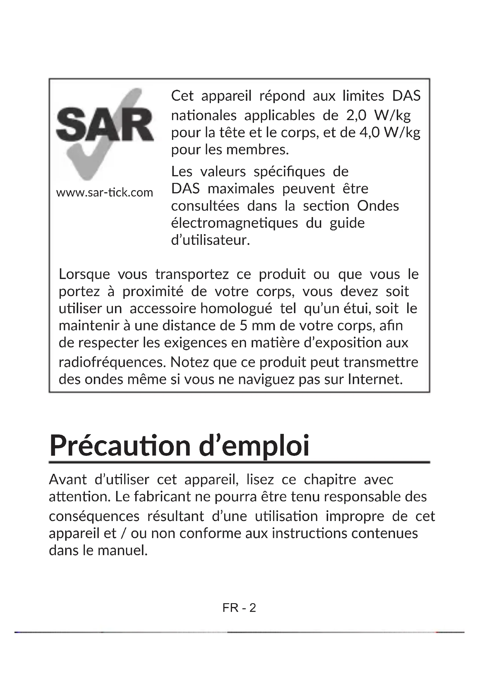 Cet appareil est un émeeur/récepteur radio. Il est conçu an de ne pas dépasser les limites d’exposion aux ondes radioélectriques (champs électromagnéques de radiofréquences) recommandées par les direcvesFR - 17 internaonales. Ces direcves ont été dénies par un organisme scienque indépendant (ICNIRP) et présentent une marge de sécurité importante desnée à assurer la sécurité de toutes les personnes, quel que soit leur âge ou leur état de santé. Les direcves d’exposion aux ondes radioélectriques ulisent une unité de mesure appelée Débit d’Absorpon Spécique ou « DAS ». La limite DAS pour les appareils mobiles est de 2,0 W/kg pour la tête et le corps, et de 4,0 W/ kg pour les membres. Les tests de DAS sont réalisés en se basant sur des posions d’ulisaon standard alors que l’appareil émet au niveau de puissance le plus élevé dans toutes les bandes de fréquences testées. Conformément aux direcves ICNIRP pour ce modèle, les valeurs de DAS les plus élevées sont les suivantes : DAS maximum pour ce modèle et condions du test. DAS avec l’appareil en contact avec le corps (5 mm) LTE Band 8 + Wi-Fi 2.4G
