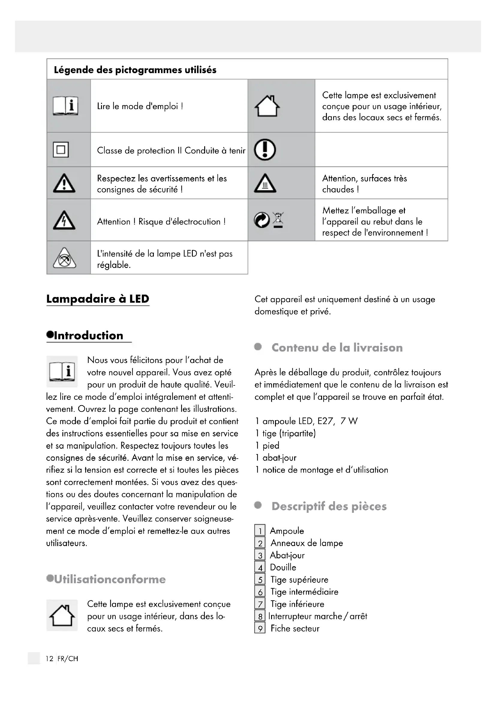 Fiche secteur Légende des pictogrammes utilisés Lire le mode d'emploi ! Cette lampe est exclusivement conçue pour un usage intérieur, dans des locaux secs et fermés. Classe de protection II Conduite à tenir Respectez les avertissements et les consignes de sécurité! Attention, surfaces très chaudes ! Attention ! Risque d'électrocution! Mettez l’emballage et l’appareil au rebut dans le respect de l'environnement ! L'intensité de la lampe LED n'est pas réglable.13 FR/CH Introduction / Sécurité Introduction