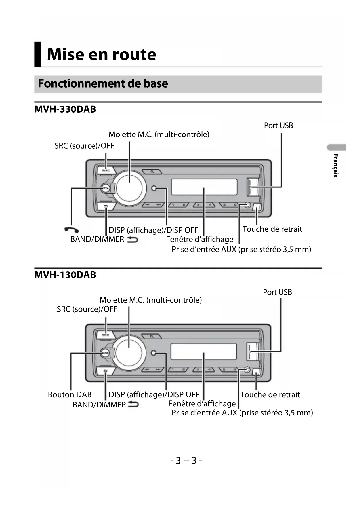 - Parmi les instructions suivantes, les clés USB ou les lecteurs audio USB sont collectivement désignés sous le nom de « périphérique USB ». Table des matières- 3 -- 3 - Français MVH-330DAB MVH-130DAB Mise en route Fonctionnement de base SRC (source)/OFF Port USB Molette M.C. (multi-contrôle) BAND/DIMMER Fenêtre d’affichage DISP (affichage)/DISP OFF Touche de retrait Prise d’entrée AUX (prise stéréo 3,5 mm) SRC (source)/OFF Touche de retrait Fenêtre d’affichage Molette M.C. (multi-contrôle) BAND/DIMMER DISP (affichage)/DISP OFF Bouton DAB Prise d’entrée AUX (prise stéréo 3,5 mm) Port USB- 4 - Français Opérations fréquemment utilisées Les touches disponibles varient selon les appareils.