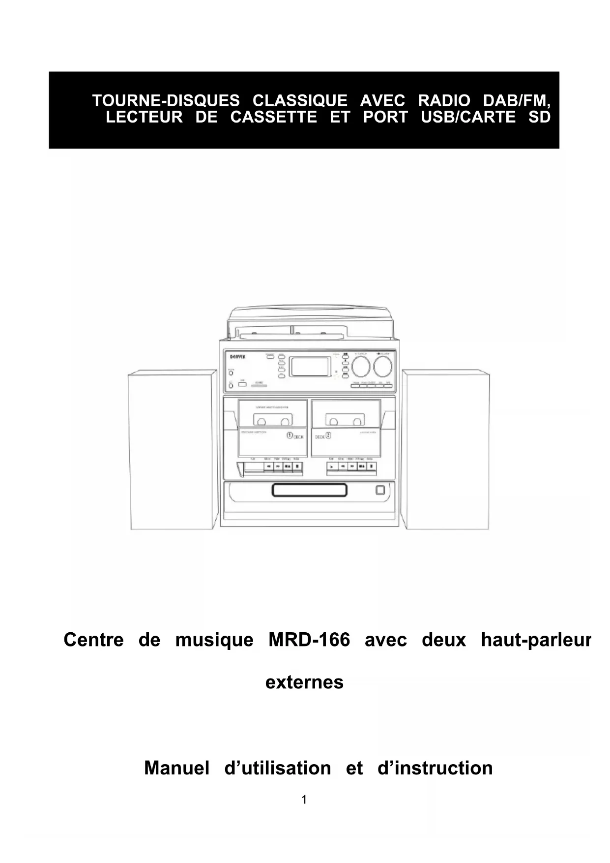 Omega 5A, Soeften DK-8382 Hinnerup Tanska www.facebook.com/denverelectronics1 TOURNE-DISQUES CLASSIQUE AVEC RADIO DAB/FM, LECTEUR DE CASSETTE ET PORT USB/CARTE SD Centre de musique MRD-166 avec deux haut-parleurs externes Manuel d’utilisation et d’instruction2