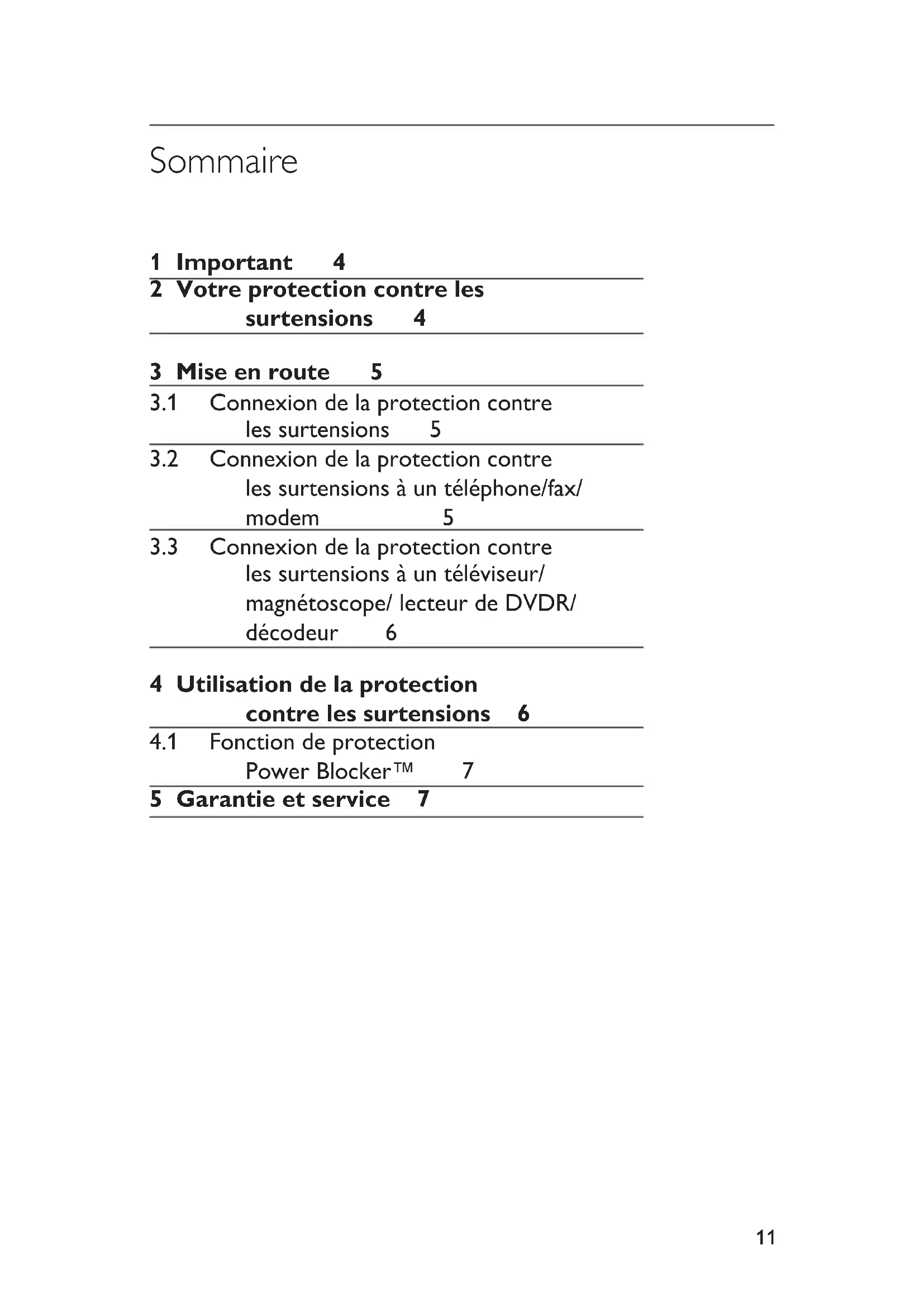 La présente garantie est limitée aux protections contre les surtensions dont l'emballage mentionne l'adjonction d'une garantie pour les équipements connectés. Avant toute réparation ou modification de la protection contre les surtensions par un prestataire non agréé par Philips, aucun problème ne peut être couvert par la présente garantie.