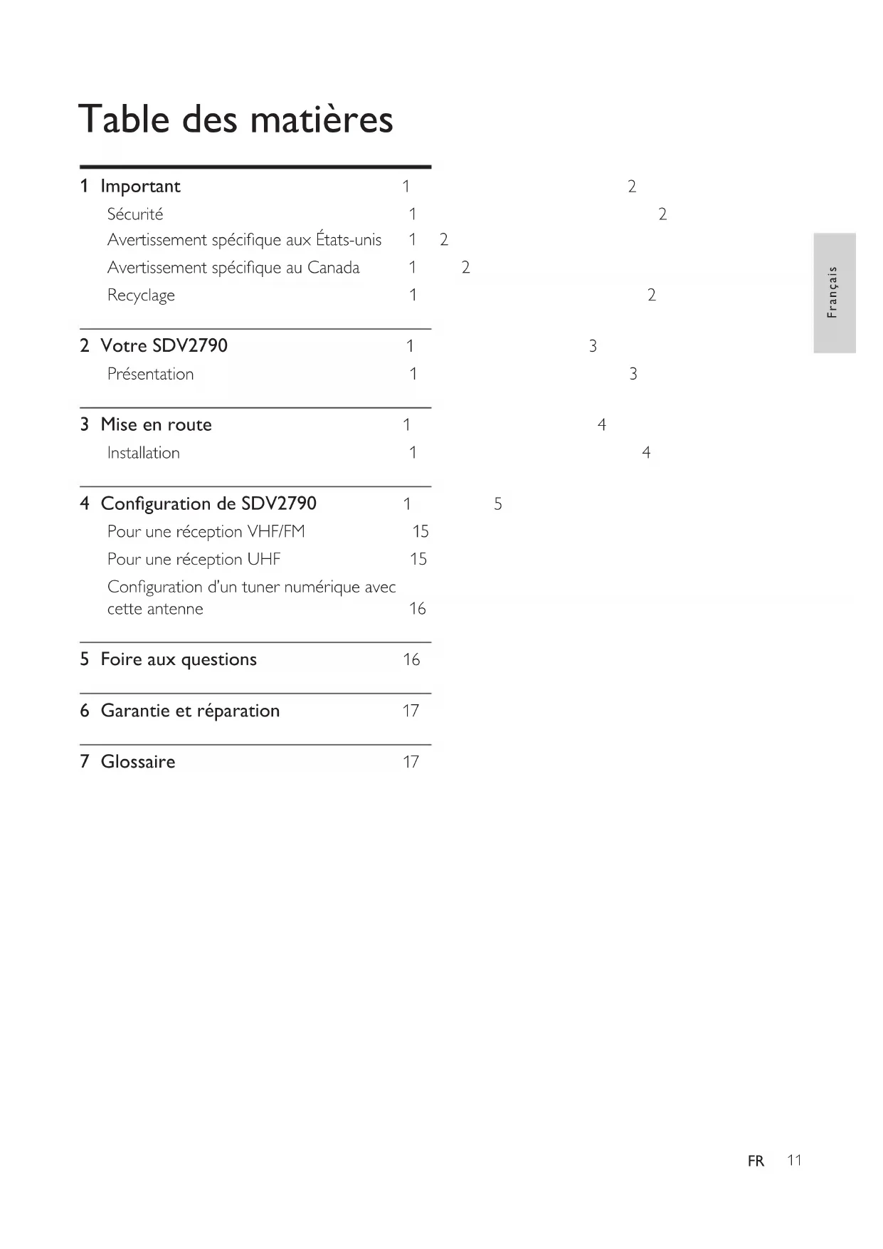 Table des matières 1 Important 12 Sécurité 12 Avertissement spécique aux États-unis 12 Avertissement spécique au Canada 12 Recyclage 12 2 Votre SDV2790 13 Présentation 13 3 Mise en route 14 Installation 14 4 Conguration de SDV2790 15 Pour une réception VHF/FM 15 Pour une réception UHF 15 Conguration d’un tuner numérique avec cette antenne 16 5 Foire aux questions 16 6 Garantie et réparation 17 7 Glossaire 1712 FR Avertissement spécique au Canada Clause de classe B Cet appareil numérique n’émet pas de bruits radioélectriques dépassant les limites applicables aux appareils numériques de classe B prescrites dans le Règlement sur le Brouillage Radioélectrique édicté par le Ministère des Communications du Canada. Cet appareil numérique de la classe B est conforme à la norme ICES-003 du Canada. Recyclage Votre produit a été conçu et fabriqué à l’aide de matériaux et composants de haute qualité, recyclables et réutilisables. Ne mettez jamais votre produit au rebut avec vos déchets ménagers. Renseignez-vous sur les réglementations locales concernant la collecte des produits électriques et électroniques. La mise au rebut citoyenne de votre ancien produit permet de protéger l’environnement et la santé. L’emballage de ce produit a été conçu pour être recyclé. Pour plus d’informations sur le recyclage de l’emballage, contactez les autorités locales. Sur un produit, ce logo signie qu’une contribution nancière a été versée au système de récupération et de recyclage national correspondant. © 2009 Koninklijke Philips Electronics N.V. Tous droits réservés. Toute reproduction, partielle ou intégrale, est interdite sans le consentement écrit préalable du détenteur des droits d’auteur. Les marques commerciales sont la propriété de Koninklijke Philips Electronics N.V. ou de leurs détenteurs respectifs. 1 Important Sécurité Ce manuel contient des informations importantes sur l’antenne de télévision d’intérieur Philips. Lisez- le attentivement avant de commencer l’installation et la conguration. Avertissement spécique aux États-unis À l’issue des tests dont il a fait l’objet, cet équipement a été déclaré conforme à la