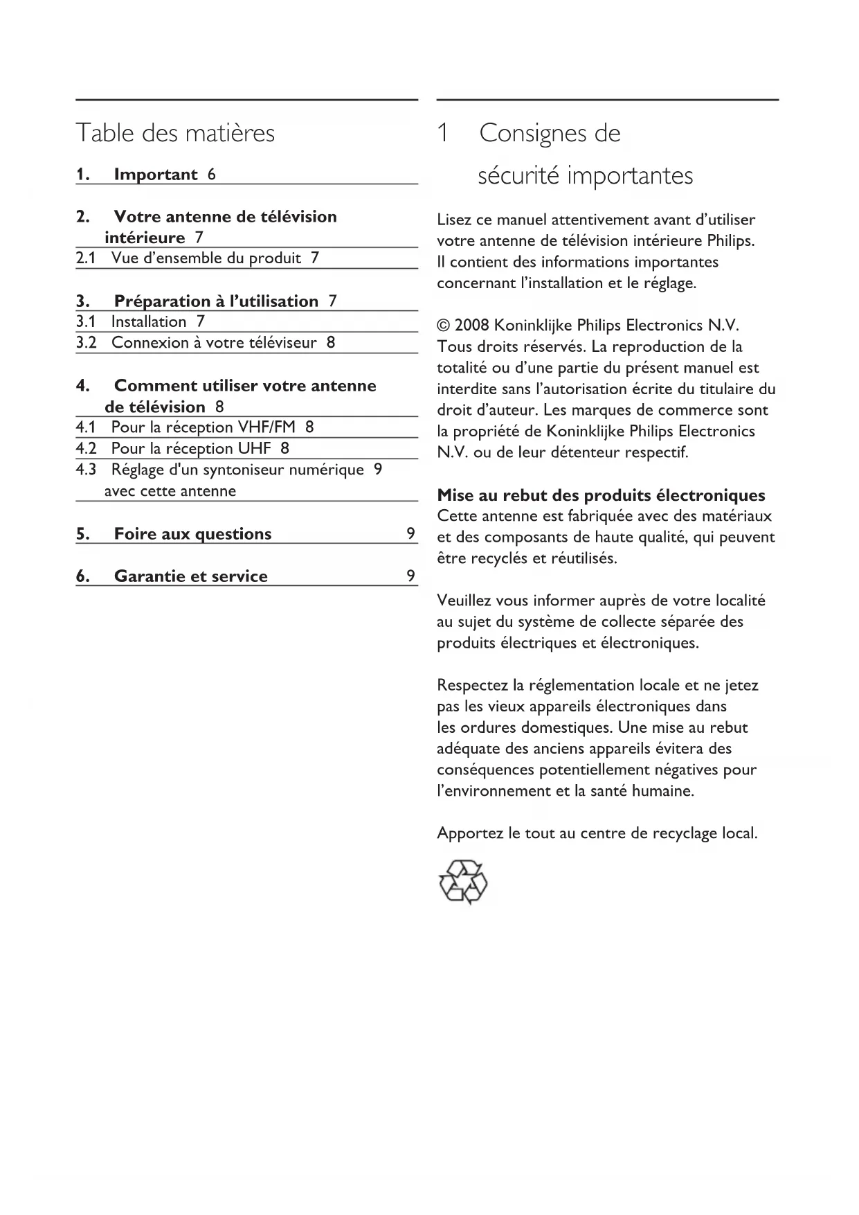 1 Consignes de sécurité importantes Lisez ce manuel attentivement avant d’utiliser votre antenne de télévision intérieure Philips. Il contient des informations importantes concernant l’installation et le réglage. © 2008 Koninklijke Philips Electronics N.V. Tous droits réservés. La reproduction de la totalité ou d’une partie du présent manuel est interdite sans l’autorisation écrite du titulaire du droit d’auteur. Les marques de commerce sont la propriété de Koninklijke Philips Electronics N.V. ou de leur détenteur respectif. Mise au rebut des produits électroniques Cette antenne est fabriquée avec des matériaux et des composants de haute qualité, qui peuvent être recyclés et réutilisés. Veuillez vous informer auprès de votre localité au sujet du système de collecte séparée des produits électriques et électroniques. Respectez la réglementation locale et ne jetez pas les vieux appareils électroniques dans les ordures domestiques. Une mise au rebut adéquate des anciens appareils évitera des conséquences potentiellement négatives pour l’environnement et la santé humaine. Apportez le tout au centre de recyclage local.7 2 Votre antenne de télévision intérieure Félicitations pour votre achat et bienvenue dans le monde Philips! Pour bénécier pleinement de l’assistance offerte par Philips, enregistrez votre produit sur le site www.philips.com/welcome