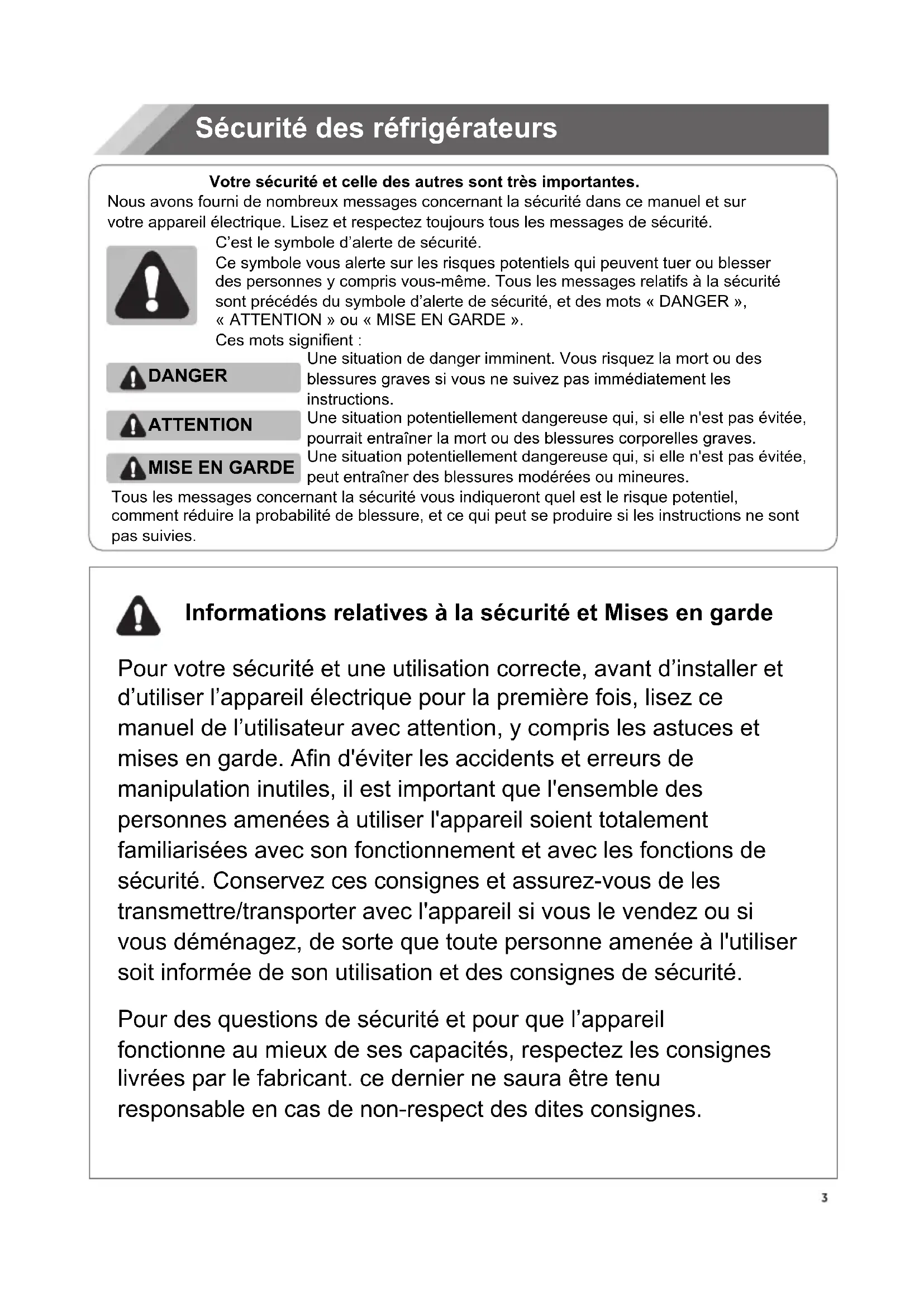 - DÉPANNAGE Sécurité des réfrigérateurs Votre sécurité et celle des autres sont très importantes. Nous avons fourni de nombreux messages concernant la sécurité dans ce manuel et sur votre appareil électrique. Lisez et respectez toujours tous les messages de sécurité. C’est le symbole d’alerte de sécurité. Ce symbole vous alerte sur les risques potentiels qui peuvent tuer ou blesser des personnes y compris vous-même. Tous les messages relatifs à la sécurité sont précédés du symbole d’alerte de sécurité, et des mots « DANGER », p. 25