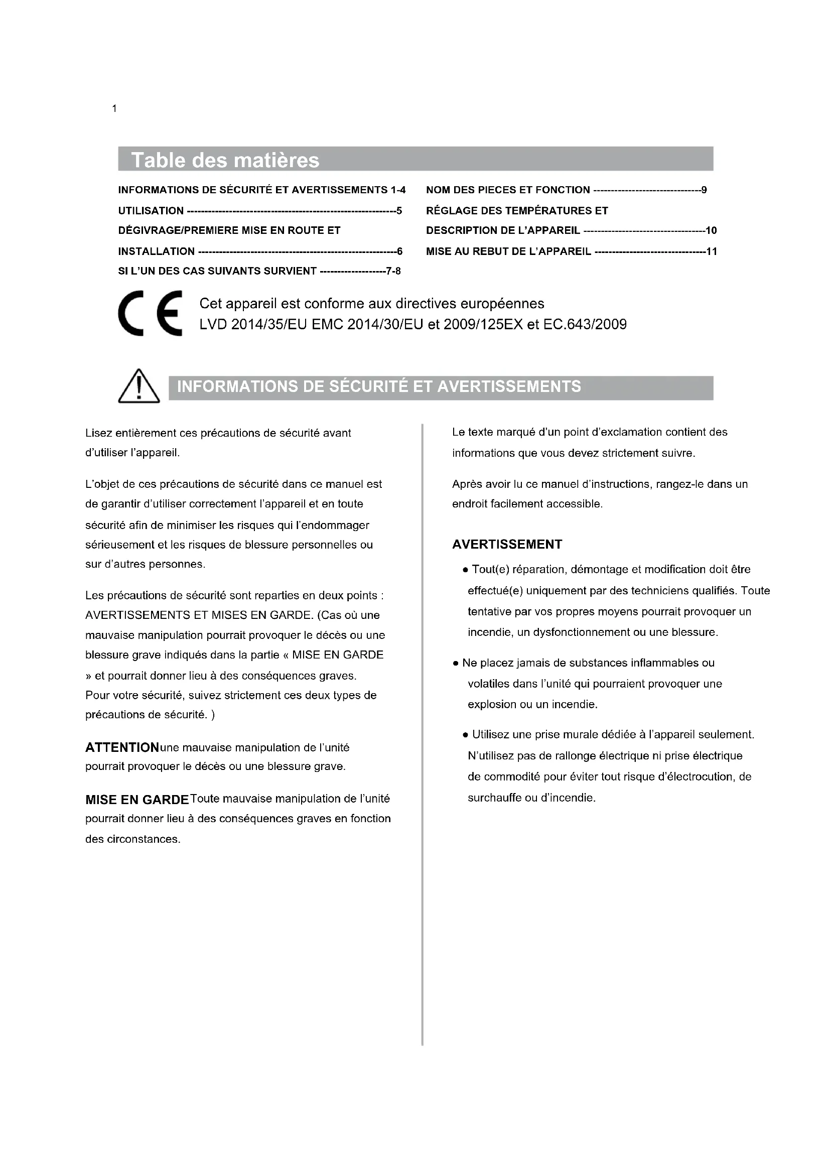 Cet appareil est conforme aux directives européennes LVD 2014/35/EU EMC 2014/30/EU et 2009/125EX et EC.643/2009 Lisez entièrement ces précautions de sécurité avant d’utiliser l’appareil. L’objet de ces précautions de sécurité dans ce manuel est de garantir d’utiliser correctement l’appareil et en toute sécurité an de minimiser les risques qui l’endommager sérieusement et les risques de blessure personnelles ou sur d’autres personnes. Les précautions de sécurité sont reparties en deux points : AVERTISSEMENTS ET MISES EN GARDE. (Cas où une mauvaise manipulation pourrait provoquer le décès ou une blessure grave indiqués dans la partie « MISE EN GARDE » et pourrait donner lieu à des conséquences graves. Pour votre sécurité, suivez strictement ces deux types de précautions de sécurité. ) ATTENTION une mauvaise manipulation de l’unité pourrait provoquer le décès ou une blessure grave.