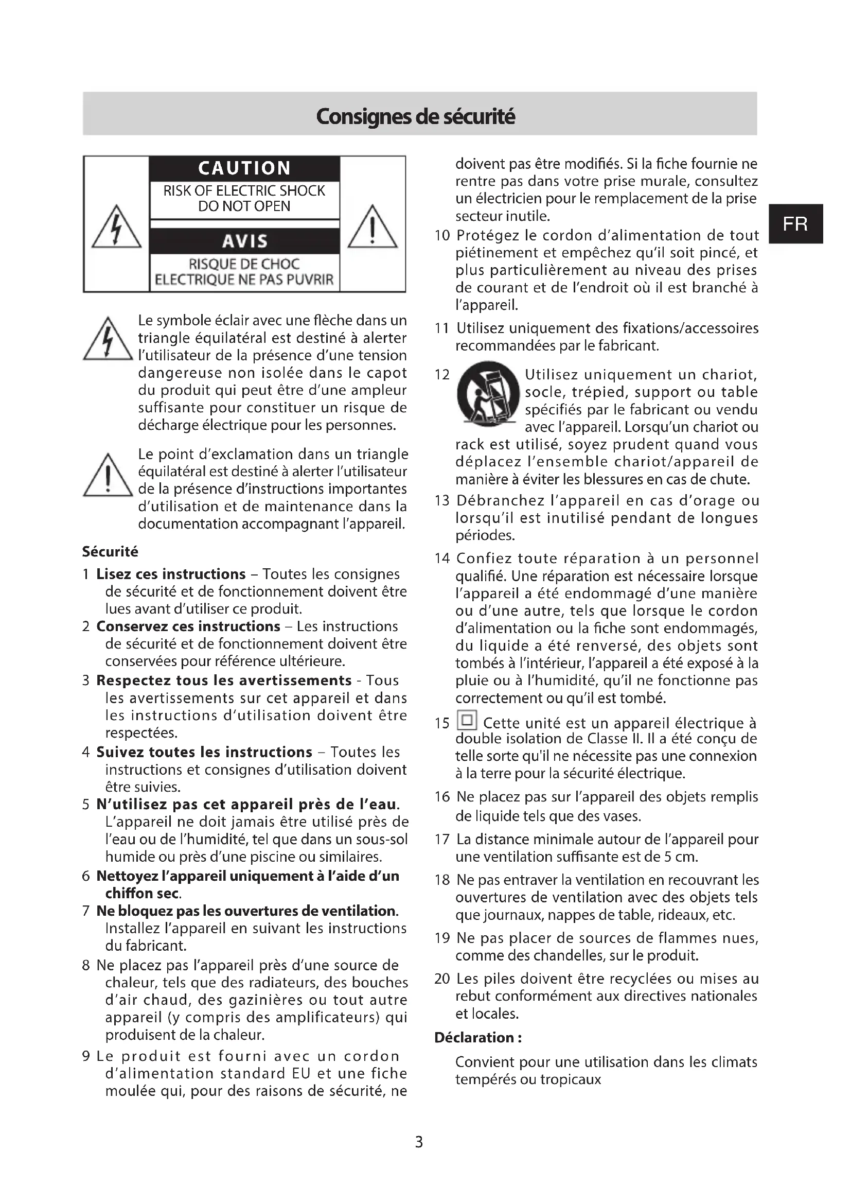 Cette unité est un appareil électrique à double isolation de Classe II. Il a été conçu de telle sorte qu'il ne nécessite pas une connexion à la terre pour la sécurité électrique. 16 Ne placez pas sur l’appareil des objets remplis de liquide tels que des vases. 17 La distance minimale autour de l’appareil pour une ventilation susante est de 5 cm. 18 Ne pas entraver la ventilation en recouvrant les ouvertures de ventilation avec des objets tels que journaux, nappes de table, rideaux, etc. 19 Ne pas placer de sources de flammes nues, comme des chandelles, sur le produit. 20 Les piles doivent être recyclées ou mises au rebut conformément aux directives nationales et locales. Déclaration: Convient pour une utilisation dans les climats tempérés ou tropicaux Consignes de sécurité Le symbole éclair avec une èche dans un triangle équilatéral est destiné à alerter l’utilisateur de la présence d’une tension dangereuse non isolée dans le capot du produit qui peut être d’une ampleur suffisante pour constituer un risque de décharge électrique pour les personnes. Le point d’exclamation dans un triangle équilatéral est destiné à alerter l’utilisateur de la présence d’instructions importantes d’utilisation et de maintenance dans la documentation accompagnant l’appareil. Sécurité 1 Lisez ces instructions – Toutes les consignes de sécurité et de fonctionnement doivent être lues avant d’utiliser ce produit. 2 Conservez ces instructions – Les instructions de sécurité et de fonctionnement doivent être conservées pour référence ultérieure. 3 Respectez tous les avertissements - Tous les avertissements sur cet appareil et dans les instructions d’utilisation doivent être respectées. 4 Suivez toutes les instructions – Toutes les instructions et consignes d’utilisation doivent être suivies. 5 N’utilisez pas cet appareil près de l’eau. L’appareil ne doit jamais être utilisé près de l’eau ou de l’humidité, tel que dans un sous-sol humide ou près d’une piscine ou similaires. 6 Nettoyez l’appareil uniquement à l’aide d’un chion sec. 7 Ne bloquez pas les ouvertures de ventilation. Installez l’appareil en suivant les instructions du fabricant. 8 Ne placez pas l’appareil près d’une source de chaleur, tels que des radiateurs, des bouches d’air chaud, des gazinières ou tout autre appareil (y compris des amplificateurs) qui produisent de la chaleur. 9 Le produit est fourni avec un cordon d’alimentation standard EU et une fiche moulée qui, pour des raisons de sécurité, ne CAUTION