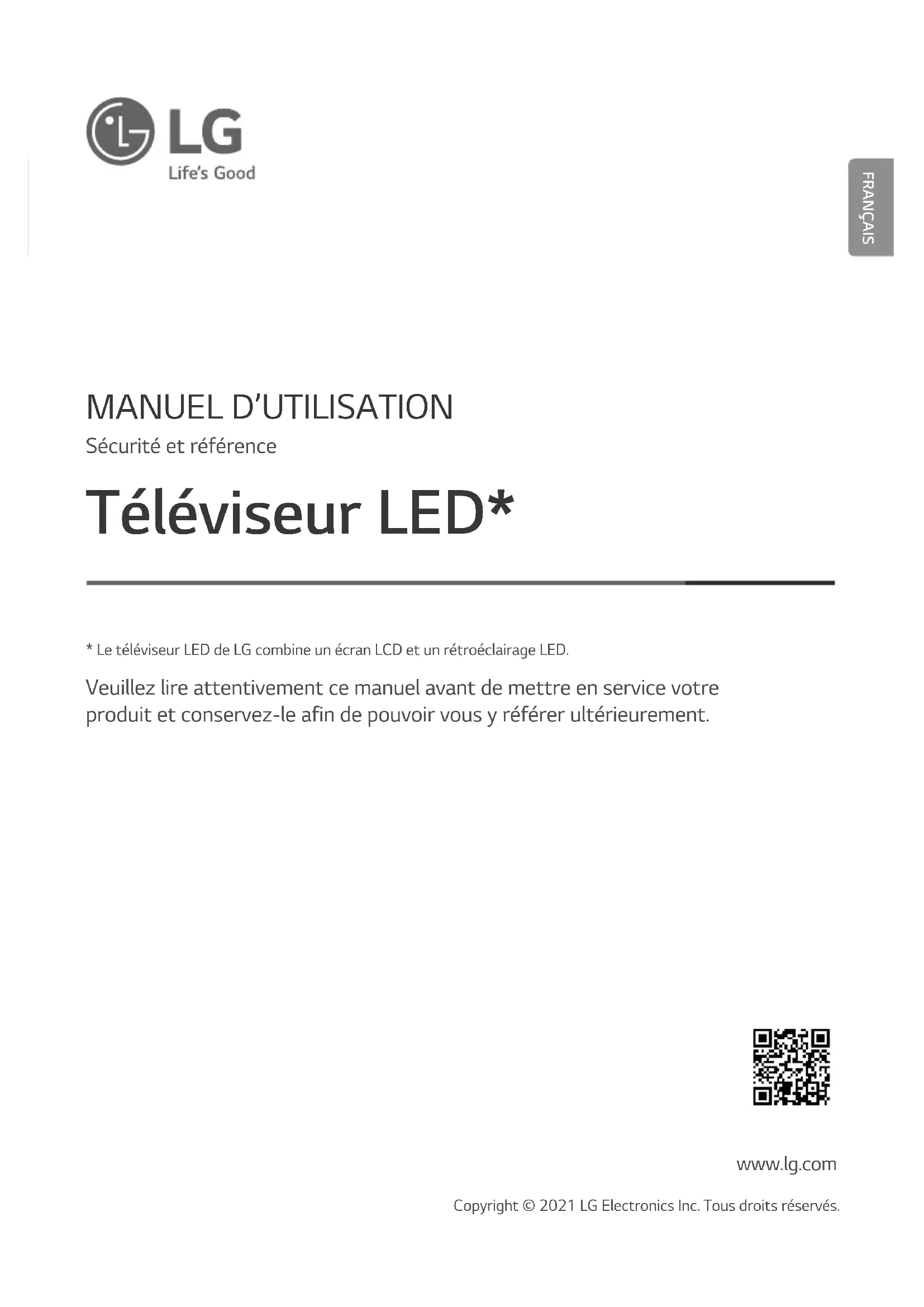 Veuillez lire attentivement ce manuel avant de mettre en service votre produit et conservez-le afin de pouvoir vous y référer ultérieurement. www.lg.com Copyright © 2021 LG Electronics Inc. Tous droits réservés.