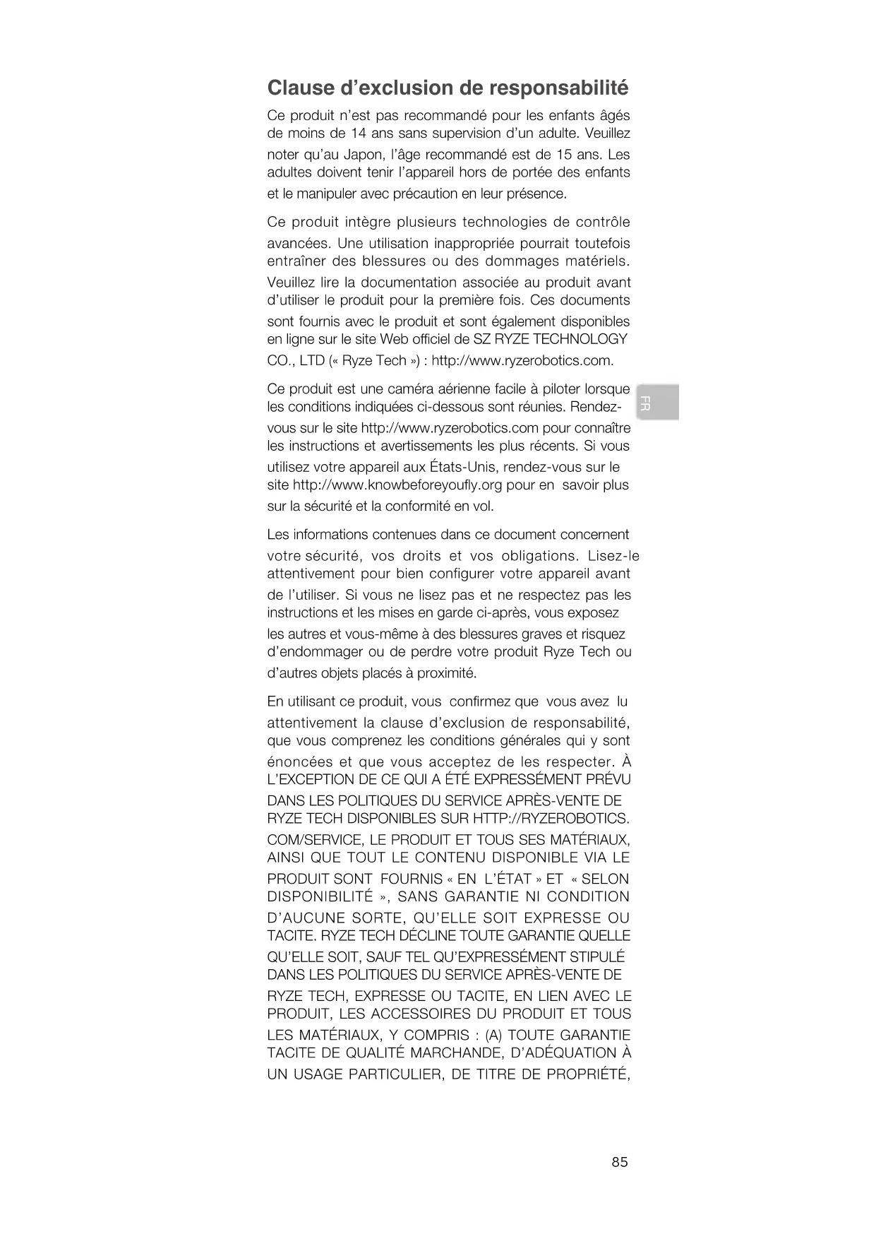 Claused’exclusionderesponsabilité Ce produit n’est pas recommandé pour les enfants âgés de moins de 14 ans sans supervision d’un adulte. Veuillez noter qu’au Japon, l’âge recommandé est de 15 ans. Les adultes doivent tenir l’appareil hors de portée des enfants et le manipuler avec précaution en leur présence. Ce produit intègre plusieurs technologies de contrôle avancées. Une utilisation inappropriée pourrait toutefois entraîner des blessures ou des dommages matériels. Veuillez lire la documentation associée au produit avant d’utiliser le produit pour la première fois. Ces documents sont fournis avec le produit et sont également disponibles en ligne sur le site Web ociel de SZ RYZE TECHNOLOGY CO., LTD (« Ryze Tech ») : http://www.ryzerobotics.com. Ce produit est une caméra aérienne facile à piloter lorsque les conditions indiquées ci-dessous sont réunies. Rendez- vous sur le site http://www.ryzerobotics.com pour connaître les instructions et avertissements les plus récents. Si vous utilisez votre appareil aux États-Unis, rendez-vous sur le site http://www.knowbeforeyouy.org pour en savoir plus sur la sécurité et la conformité en vol. Les informations contenues dans ce document concernent votre sécurité, vos droits et vos obligations. Lisez-le attentivement pour bien configurer votre appareil avant de l’utiliser. Si vous ne lisez pas et ne respectez pas les instructions et les mises en garde ci-après, vous exposez les autres et vous-même à des blessures graves et risquez d’endommager ou de perdre votre produit Ryze Tech ou d’autres objets placés à proximité. En utilisant ce produit, vous conrmez que vous avez lu attentivement la clause d’exclusion de responsabilité, que vous comprenez les conditions générales qui y sont énoncées et que vous acceptez de les respecter. À L’EXCEPTION DE CE QUI A ÉTÉ EXPRESSÉMENT PRÉVU DANS LES POLITIQUES DU SERVICE APRÈS-VENTE DE RYZE TECH DISPONIBLES SUR HTTP://RYZEROBOTICS. COM/SERVICE, LE PRODUIT ET TOUS SES MATÉRIAUX, AINSI QUE TOUT LE CONTENU DISPONIBLE VIA LE PRODUIT SONT FOURNIS « EN L’ÉTAT » ET « SELON