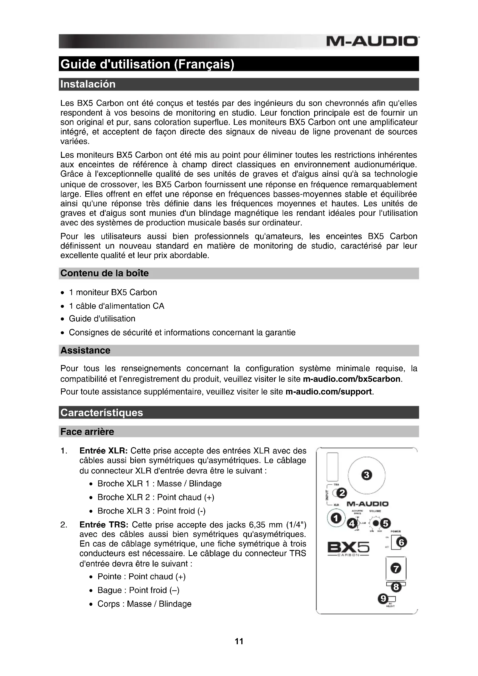 - Consignes de sécurité et informations concernant la garantie Assistance Pour tous les renseignements concernant la configuration système minimale requise, la compatibilité et l’enregistrement du produit, veuillez visiter le site m-audio.com/bx5carbon. Pour toute assistance supplémentaire, veuillez visiter le site m-audio.com/support. Característiques Face arrière