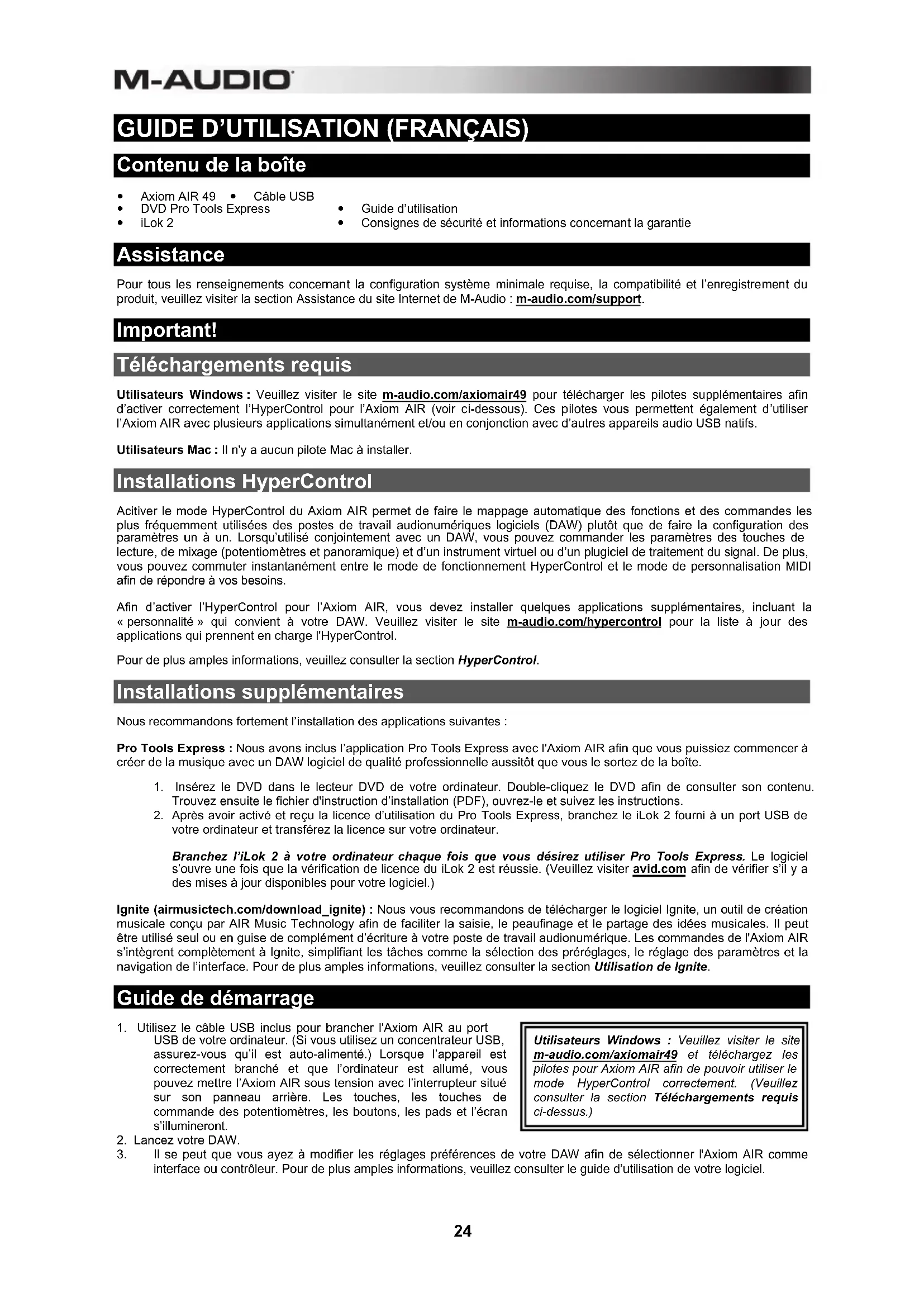 nuevo. Cómo controlar Ignite Ignite, incluido en su Axiom AIR, es una herramienta creativa diseñada para una captura, refinación y uso compartido rápidos y fluidos de las ideas musicales. Puede utilizarlo en forma autónoma o como complemento de su DAW favorita. Para descargar Ignite, visite airmusictech.com/download_ignite. Para información más detallada sobre Ignite, consulte la documentación de dicha herramienta. Los teclados Axiom AIR vienen preconfigurados para controlar a Ignite mediante HyperControl. Cuando usted abre Ignite con su Axiom AIR conectado a la computadora, puede usar los controles del Axiom AIR de las siguientes maneras: Controles de transporte Pulse el botón de modo de mezcla de HyperControl (botón ) del panel de control principal y use luego los botones de transporte para controlar las funciones de transporte de Ignite. Navegación Use los botones direccionales para navegar por las pestañas y submenús de Ignite, en función del enfoque de control en uso. Instrumentos Consulte la Guía del usuario de HyperControl correspondiente a su Ignite (en m-audio.com/hypercontrol) para ver qué parámetro está asignado a cada control.24 GUIDE D’UTILISATION (FRANÇAIS) Contenu de la boîte Axiom AIR 49 Câble USB DVD Pro Tools Express Guide d’utilisation iLok 2 Consignes de sécurité et informations concernant la garantie Assistance Pour tous les renseignements concernant la configuration système minimale requise, la compatibilité et l’enregistrement du produit, veuillez visiter la section Assistance du site Internet de M-Audio : m-audio.com/support. Important! Téléchargements requis Utilisateurs Windows : Veuillez visiter le site m-audio.com/axiomair49 pour télécharger les pilotes supplémentaires afin d’activer correctement l’HyperControl pour l’Axiom AIR (voir ci-dessous). Ces pilotes vous permettent également d’utiliser l’Axiom AIR avec plusieurs applications simultanément et/ou en conjonction avec d’autres appareils audio USB natifs. Utilisateurs Mac : Il n'y a aucun pilote Mac à installer. Installations HyperControl Acitiver le mode HyperControl du Axiom AIR permet de faire le mappage automatique des fonctions et des commandes les plus fréquemment utilisées des postes de travail audionumériques logiciels (DAW) plutôt que de faire la configuration des paramètres un à un. Lorsqu’utilisé conjointement avec un DAW, vous pouvez commander les paramètres des touches de lecture, de mixage (potentiomètres et panoramique) et d’un instrument virtuel ou d’un plugiciel de traitement du signal. De plus, vous pouvez commuter instantanément entre le mode de fonctionnement HyperControl et le mode de personnalisation MIDI afin de répondre à vos besoins. Afin d’activer l’HyperControl pour l’Axiom AIR, vous devez installer quelques applications supplémentaires, incluant la « personnalité » qui convient à votre DAW. Veuillez visiter le site m-audio.com/hypercontrol pour la liste à jour des applications qui prennent en charge l'HyperControl. Pour de plus amples informations, veuillez consulter la section HyperControl. Installations supplémentaires Nous recommandons fortement l’installation des applications suivantes : Pro Tools Express : Nous avons inclus l’application Pro Tools Express avec l'Axiom AIR afin que vous puissiez commencer à créer de la musique avec un DAW logiciel de qualité professionnelle aussitôt que vous le sortez de la boîte.