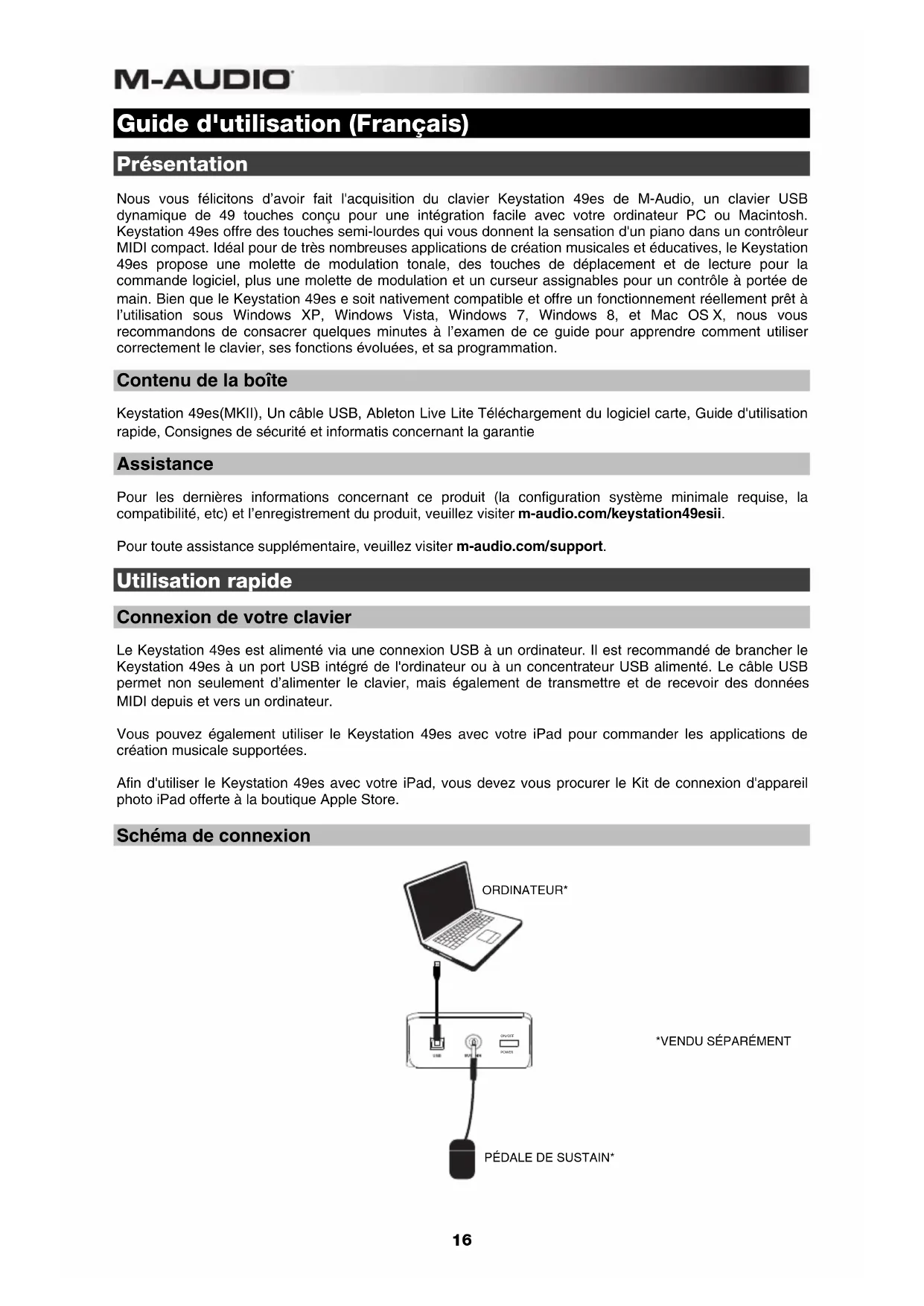 Assistance Pour les dernières informations concernant ce produit (la configuration système minimale requise, la compatibilité, etc) et l’enregistrement du produit, veuillez visiter m-audio.com/keystation49esii. Pour toute assistance supplémentaire, veuillez visiter m-audio.com/support. Utilisation rapide Connexion de votre clavier Le Keystation 49es est alimenté via une connexion USB à un ordinateur. Il est recommandé de brancher le Keystation 49es à un port USB intégré de l'ordinateur ou à un concentrateur USB alimenté. Le câble USB permet non seulement d’alimenter le clavier, mais également de transmettre et de recevoir des données MIDI depuis et vers un ordinateur. Vous pouvez également utiliser le Keystation 49es avec votre iPad pour commander les applications de création musicale supportées. Afin d'utiliser le Keystation 49es avec votre iPad, vous devez vous procurer le Kit de connexion d'appareil photo iPad offerte à la boutique Apple Store. Schéma de connexion
