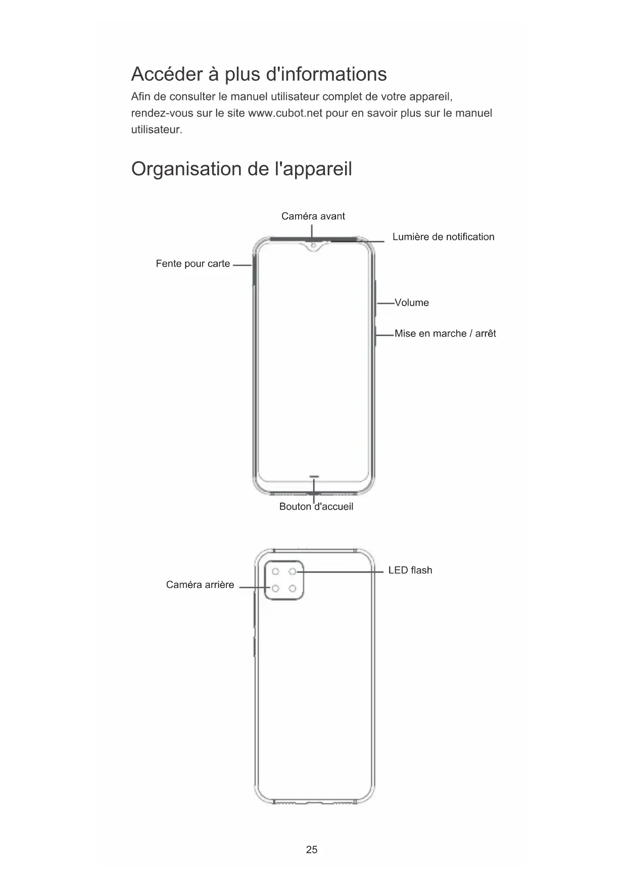 22Company Address Shenzhen Huafurui Technology Co., Ltd. Unit 1401 &1402, 14/F, Jin qi zhi gu mansion (No. 4 building of Chong wen Garden), Crossing of the Liu xian street and Tang ling road, Tao yuan street, Nan shan district, Shenzhen, P.R. China.518055 23X20 GUIDE DE DÉMARRAGE RAPIDE 24Accéder à plus d'informations Organisation de l'appareil Afin de consulter le manuel utilisateur complet de votre appareil, rendez-vous sur le site www.cubot.net pour en savoir plus sur le manuel utilisateur.