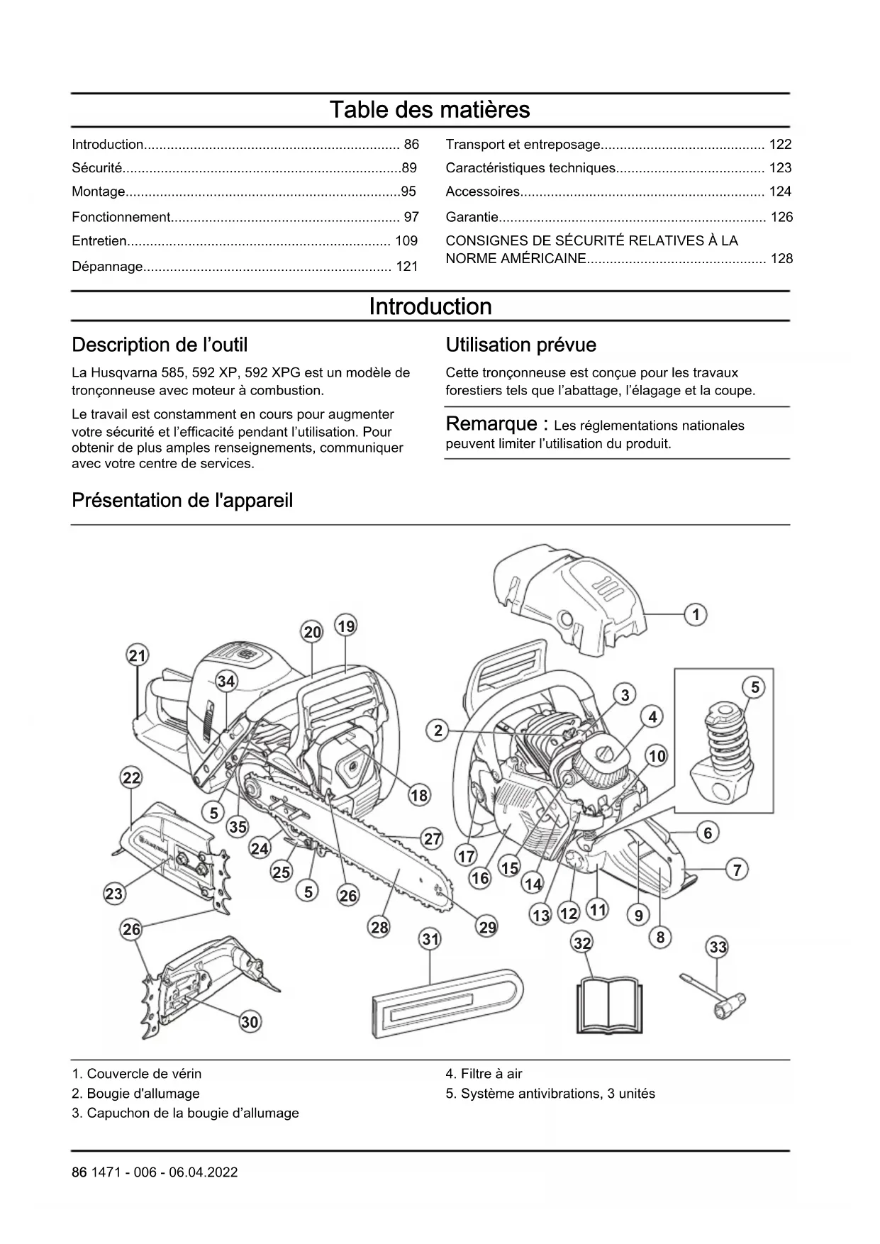 Introduction Description de l’outil La Husqvarna 585, 592 XP, 592 XPG est un modèle de tronçonneuse avec moteur à combustion. Le travail est constamment en cours pour augmenter votre sécurité et l’efficacité pendant l’utilisation. Pour obtenir de plus amples renseignements, communiquer avec votre centre de services. Utilisation prévue Cette tronçonneuse est conçue pour les travaux forestiers tels que l’abattage, l’élagage et la coupe. Remarque : Les réglementations nationales peuvent limiter l’utilisation du produit. Présentation de l'appareil