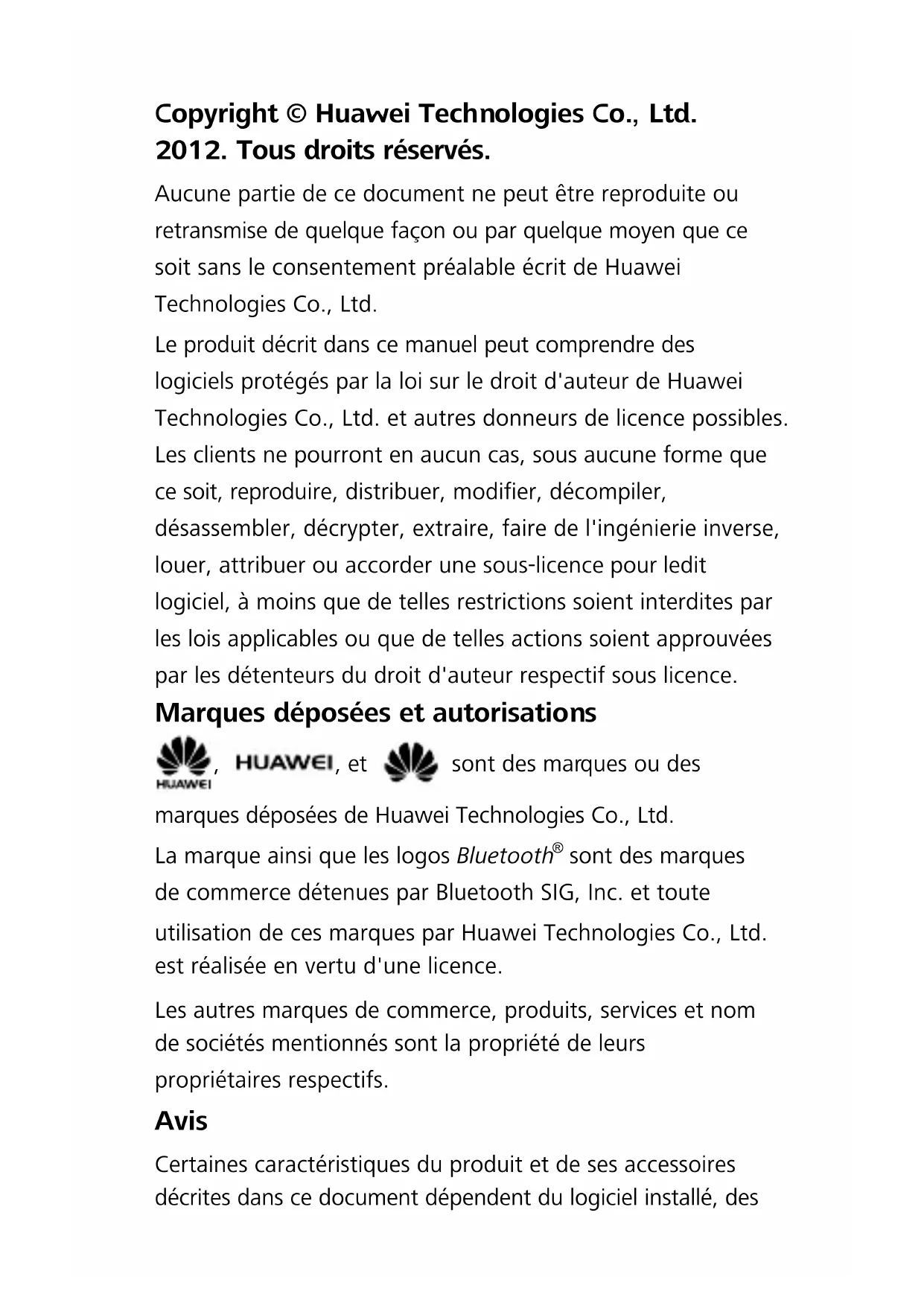 Copyright © Huawei Technologies Co., Ltd. 2012. Tous droits réservés. Aucune partie de ce document ne peut être reproduite ou retransmise de quelque façon ou par quelque moyen que ce soit sans le consentement préalable écrit de Huawei Technologies Co., Ltd. Le produit décrit dans ce manuel peut comprendre des logiciels protégés par la loi sur le droit d'auteur de Huawei Technologies Co., Ltd. et autres donneurs de licence possibles. Les clients ne pourront en aucun cas, sous aucune forme que ce soit, reproduire, distribuer, modifier, décompiler, désassembler, décrypter, extraire, faire de l'ingénierie inverse, louer, attribuer ou accorder une sous-licence pour ledit logiciel, à moins que de telles restrictions soient interdites par les lois applicables ou que de telles actions soient approuvées par les détenteurs du droit d'auteur respectif sous licence. Marques déposées et autorisations , , et sont des marques ou des marques déposées de Huawei Technologies Co., Ltd. La marque ainsi que les logos Bluetooth