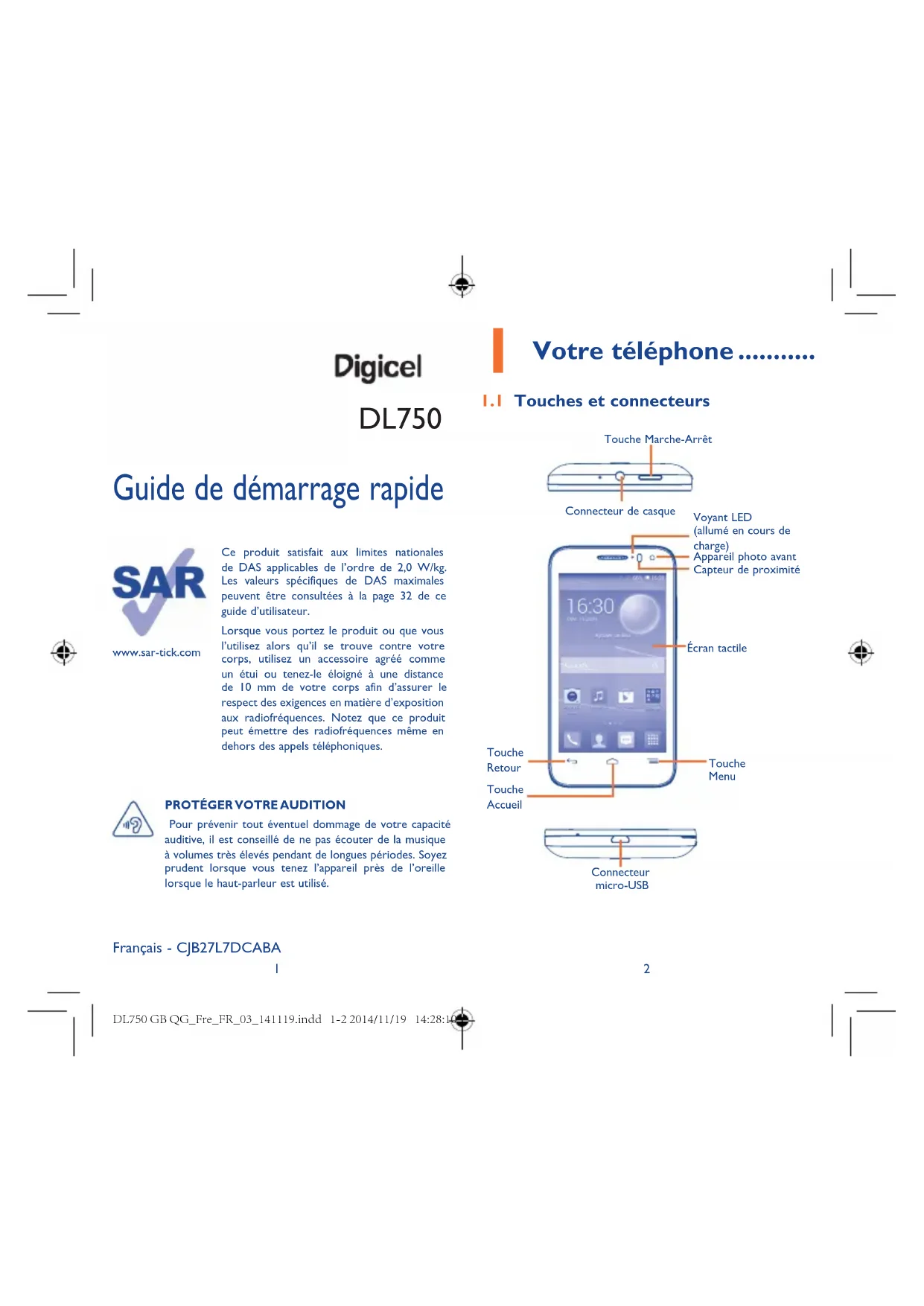 Votre téléphone 11 Touches et connecteurs Capteur de proximitéAppareil photo avantConnecteur de casque Touche Marche-ArrêtConnecteur micro-USBTouche RetourTouche AccueilTouche Menu Écran tactileVoyant LED(allumé en cours de charge) Guide de démarrage rapide www.sar-tick.comCe produit satisfait aux limites nationales de DAS applicables de l’ordre de 2,0 W/kg. Les valeurs spécifiques de DAS maximales peuvent être consultées à la page 32 de ce guide d’utilisateur.Lorsque vous portez le produit ou que vous l’utilisez alors qu’il se trouve contre votre corps, utilisez un accessoire agréé comme un étui ou tenez-le éloigné à une distance de 10 mm de votre corps afin d’assurer le respect des exigences en matière d’exposition aux radiofréquences. Notez que ce produit peut émettre des radiofréquences même en dehors des appels téléphoniques.PROTÉGER VOTRE AUDITION Pour prévenir tout éventuel dommage de votre capacité auditive, il est conseillé de ne pas écouter de la musique à volumes très élevés pendant de longues périodes. Soyez prudent lorsque vous tenez l’appareil près de l’oreille lorsque le haut-parleur est utilisé.Français - CJB27L7DCABA DL750 DL750 GB QG_Fre_FR_03_141119.indd 1-2 2014/11/19 14:28:103 4 Volume haut Volume bas Appareil photo Flash Touche Menu