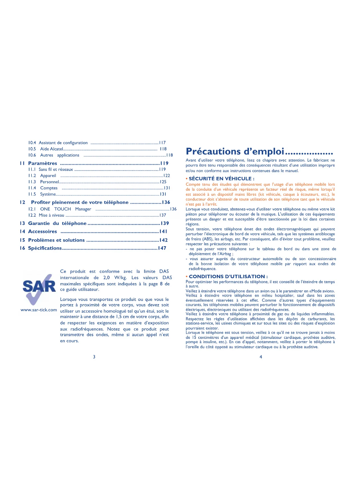 - 16 Spécifications Précautions d’emploi Avant d’utiliser votre téléphone, lisez ce chapitre avec attention. Le fabricant ne pourra être tenu responsable des conséquences résultant d’une utilisation impropre et/ou non conforme aux instructions contenues dans le manuel. p. 147