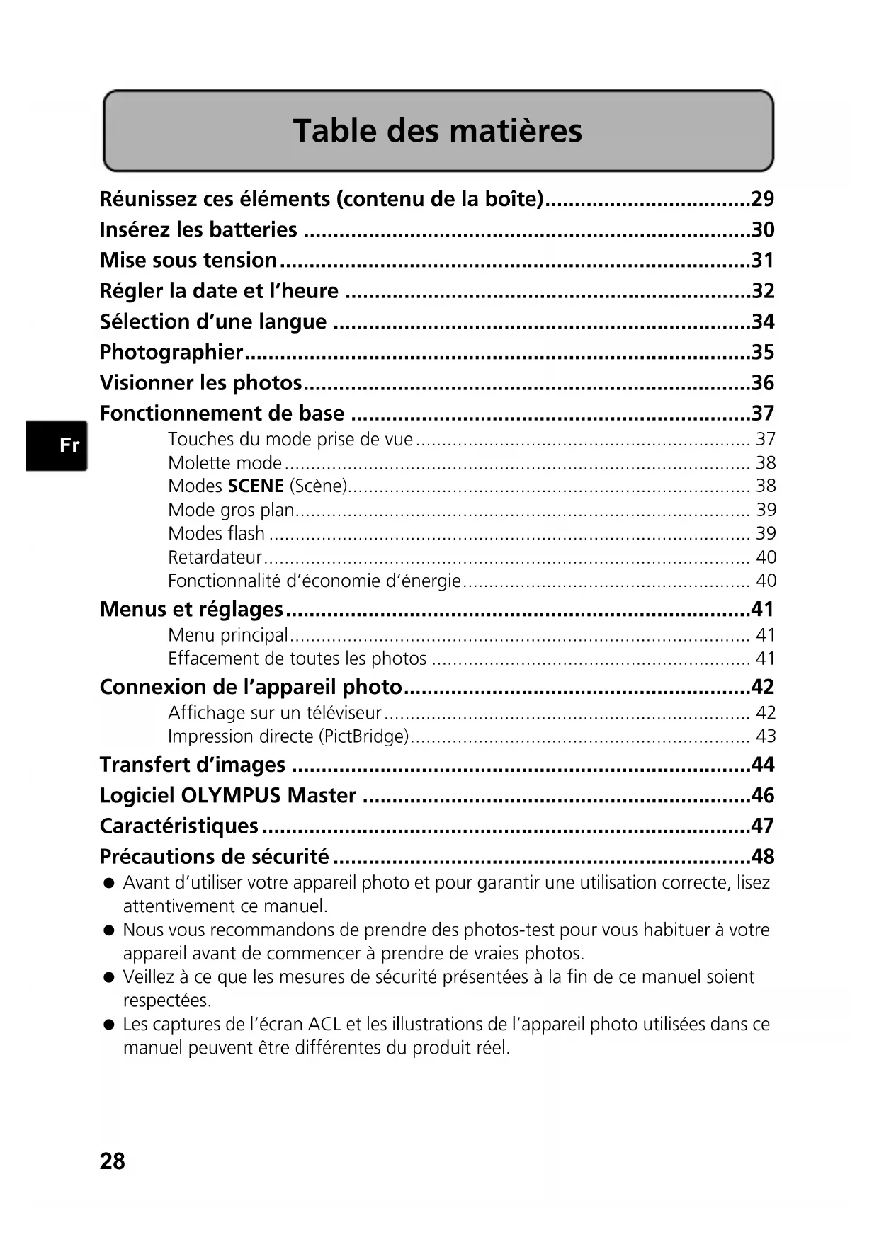 - Précautions de sécurité Avant d’utiliser votre appareil photo et pour garantir une utilisation correcte, lisez attentivement ce manuel. Nous vous recommandons de prendre des photos-test pour vous habituer à votre appareil avant de commencer à prendre de vraies photos. Veillez à ce que les mesures de sécurité présentées à la fin de ce manuel soient respectées. Les captures de l’écran ACL et les illustrations de l’appareil photo utilisées dans ce manuel peuvent être différentes du produit réel. Table des matières d4324_oai_f_basic_00_bookfile.book Page 28 Wednesday, July 5, 2006 3:06 PM29 p. 48