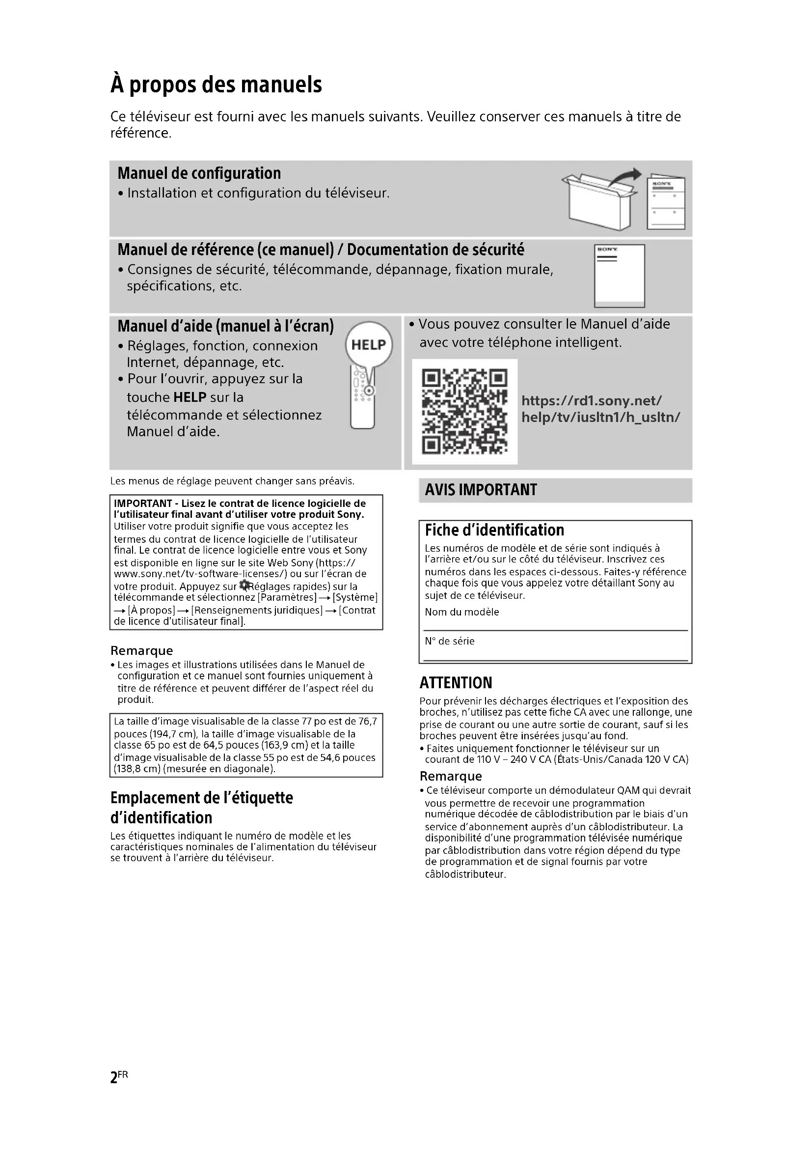 - Vous pouvez consulter le Manuel d’aide avec votre téléphone intelligent. https://rd1.sony.net/ help/tv/iusltn1/h_usltn/ IMPORTANT - Lisez le contrat de licence logicielle de l’utilisateur final avant d’utiliser votre produit Sony. Utiliser votre produit signifie que vous acceptez les termes du contrat de licence logicielle de l’utilisateur final. Le contrat de licence logicielle entre vous et Sony est disponible en ligne sur le site Web Sony (https://www.sony.net/tv-software-licenses/) ou sur l’écran de votre produit. Appuyez sur (Réglages rapides) sur la télécommande et sélectionnez [Paramètres] t [Système] t [À propos] t [Renseignements juridiques] t [Contrat de licence d'utilisateur final].La taille d’image visualisable de la classe 77 po est de 76,7 pouces (194,7 cm), la taille d’image visualisable de la classe 65 po est de 64,5 pouces (163,9 cm) et la taille d’image visualisable de la classe 55 po est de 54,6 pouces (138,8 cm) (mesurée en diagonale). Fiche d’identification Les numéros de modèle et de série sont indiqués à l’arrière et/ou sur le côté du téléviseur. Inscrivez ces numéros dans les espaces ci-dessous. Faites-y référence chaque fois que vous appelez votre détaillant Sony au sujet de ce téléviseur.Nom du modèleN° de sérieD:\SONY TV\SY21_AT_UCM_RG_111\AT UCM CF\5026348111_FR.fm master page: Right XR-77A80J / 77A80CJ / 65A80J / 65A80CJ / 55A80J 5-026-348-11(1)