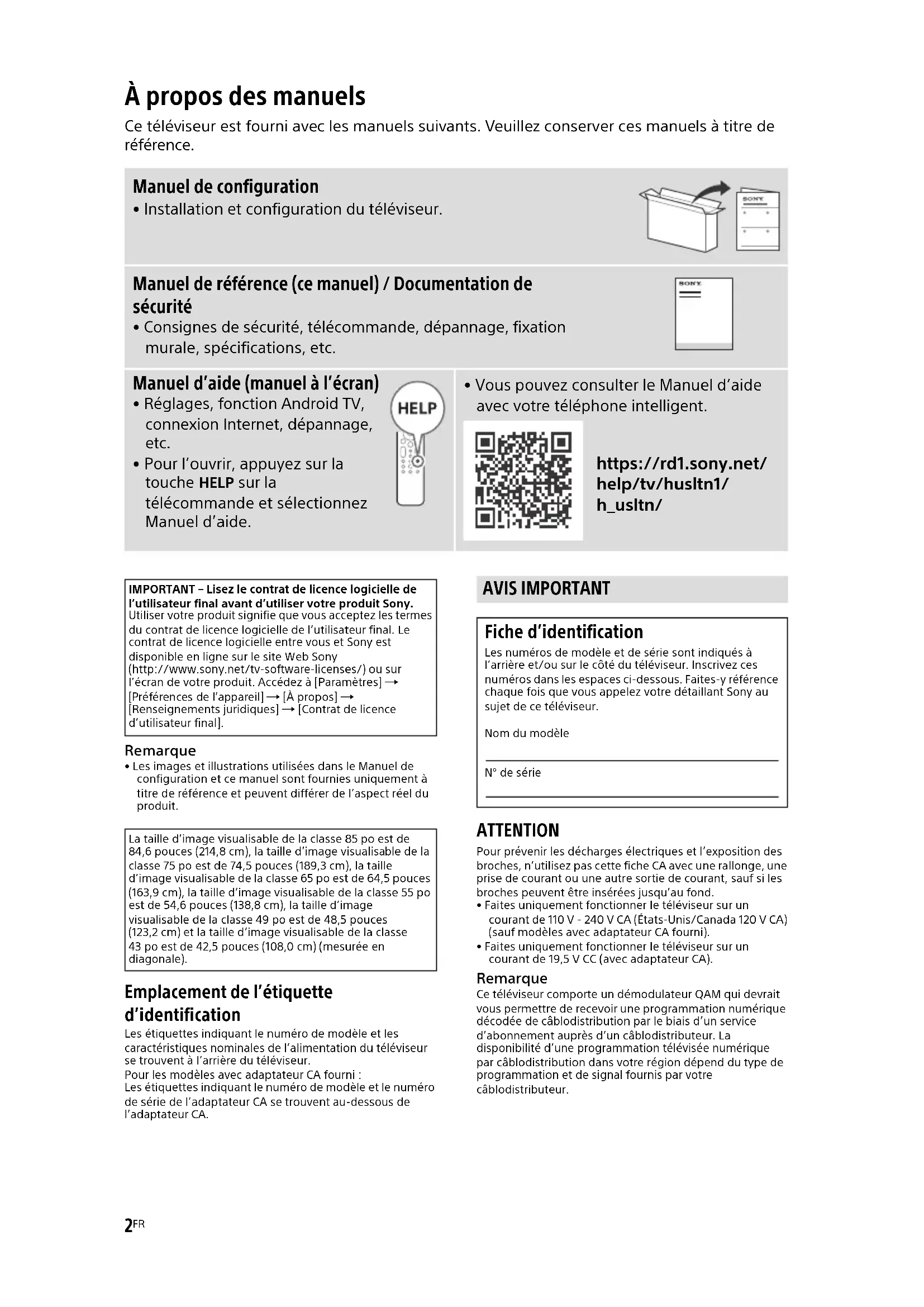 - Vous pouvez consulter le Manuel d’aide avec votre téléphone intelligent. https://rd1.sony.net/ help/tv/husltn1/ h_usltn/ IMPORTANT – Lisez le contrat de licence logicielle de l’utilisateur final avant d’utiliser votre produit Sony. Utiliser votre produit signifie que vous acceptez les termes du contrat de licence logicielle de l’utilisateur final. Le contrat de licence logicielle entre vous et Sony est disponible en ligne sur le site Web Sony (http://www.sony.net/tv-software-licenses/) ou sur l’écran de votre produit. Accédez à [Paramètres] [Préférences de l’appareil] [À propos] [Renseignements juridiques] [Contrat de licence d’utilisateur final].La taille d’image visualisable de la classe 85 po est de 84,6 pouces (214,8 cm), la taille d’image visualisable de la classe 75 po est de 74,5 pouces (189,3 cm), la taille d’image visualisable de la classe 65 po est de 64,5 pouces (163,9 cm), la taille d’image visualisable de la classe 55 po est de 54,6 pouces (138,8 cm), la taille d’image visualisable de la classe 49 po est de 48,5 pouces (123,2 cm) et la taille d’image visualisable de la classe 43 po est de 42,5 pouces (108,0 cm) (mesurée en diagonale). Fiche d’identification Les numéros de modèle et de série sont indiqués à l’arrière et/ou sur le côté du téléviseur. Inscrivez ces numéros dans les espaces ci-dessous. Faites-y référence chaque fois que vous appelez votre détaillant Sony au sujet de ce téléviseur.Nom du modèleN° de série3