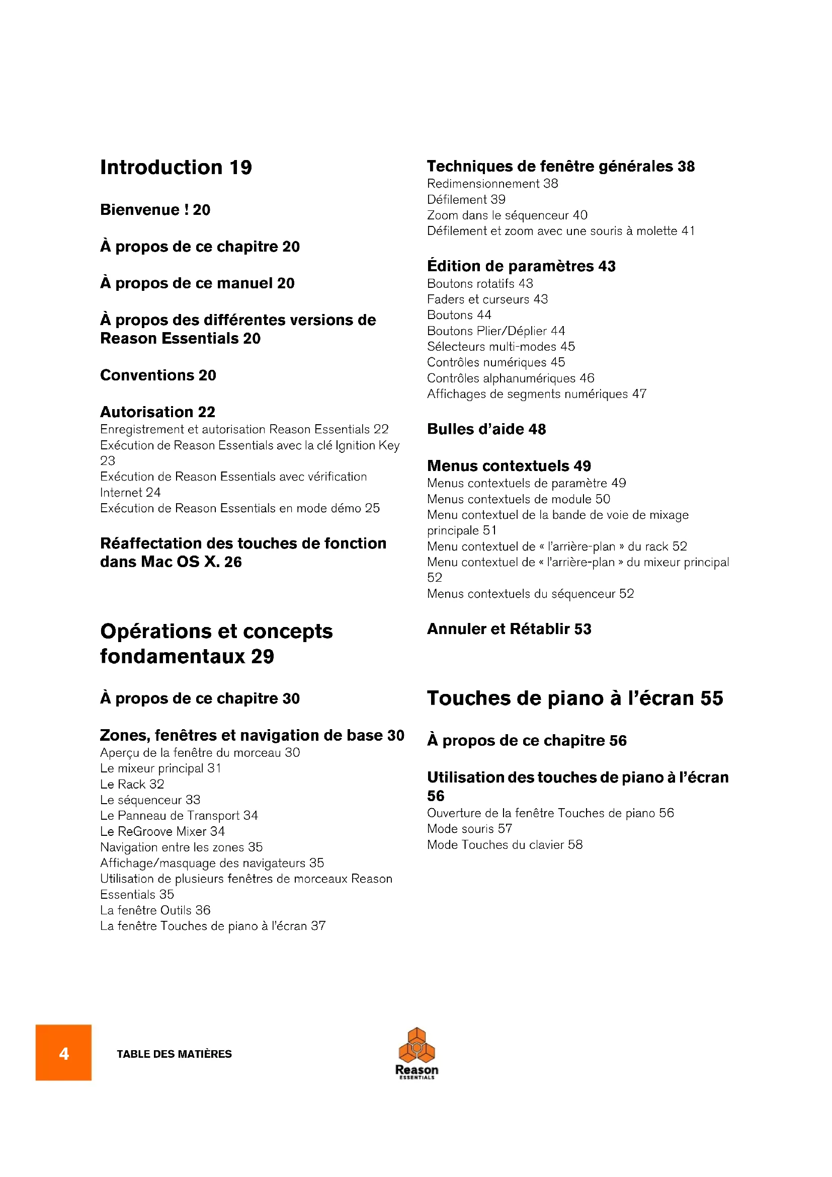 Introduction 19 Bienvenue ! 20 À propos de ce chapitre 20 À propos de ce manuel 20 À propos des différentes versions de Reason Essentials 20 Conventions 20 Autorisation 22 Enregistrement et autorisation Reason Essentials 22 Exécution de Reason Essentials avec la clé Ignition Key