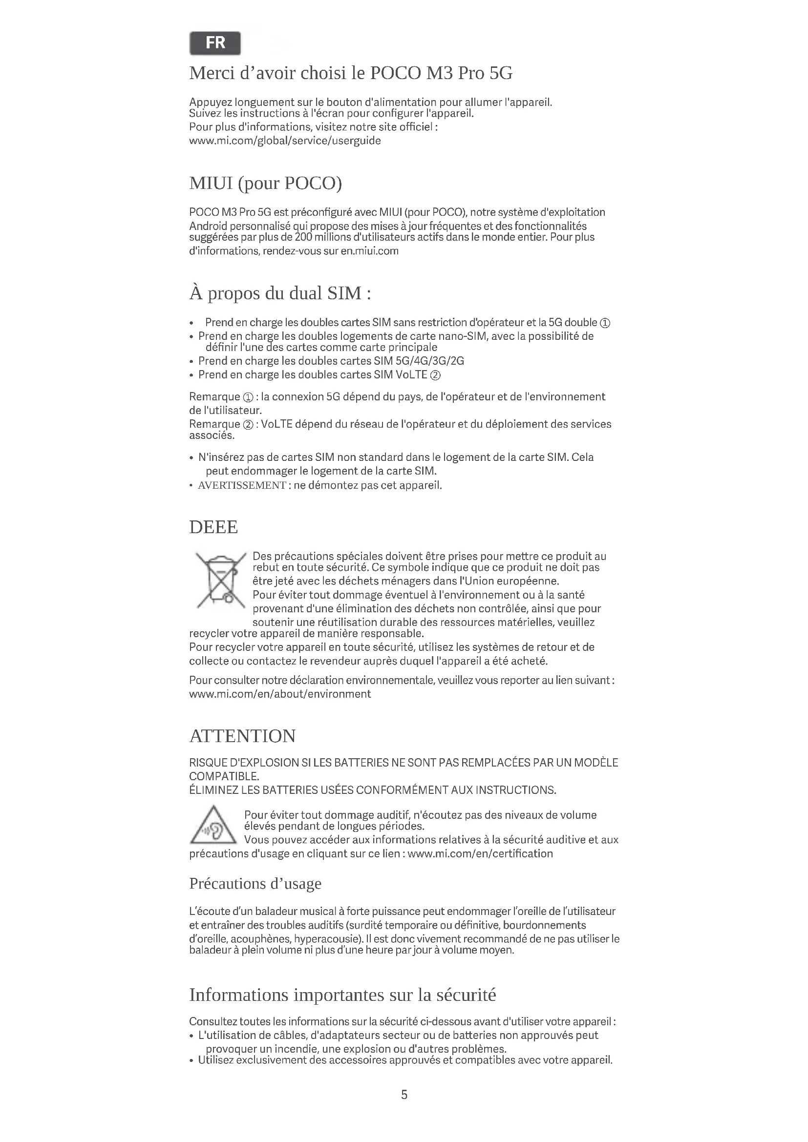 - AVERTISSEMENT : ne démontez pas cet appareil. DEEE Des précautions spéciales doivent être prises pour mere ce produit au rebut en toute sécurité. Ce symbole indique que ce produit ne doit pas être jeté avec les déchets ménagers dans l'Union européenne. Pour éviter tout dommage éventuel à l'environnement ou à la santé provenant d'une élimination des déchets non contrôlée, ainsi que pour soutenir une réutilisation durable des ressources matérielles, veuillez recycler votre appareil de manière responsable. Pour recycler votre appareil en toute sécurité, utilisez les systèmes de retour et de collecte ou contactez le revendeur auprès duquel l'appareil a été acheté. Pour consulter notre déclaration environnementale, veuillez vous reporter au lien suivant : www.mi.com/en/about/environment ATTENTION RISQUE D'EXPLOSION SI LES BATTERIES NE SONT PAS REMPLACÉES PAR UN MODÈLE COMPATIBLE. ÉLIMINEZ LES BATTERIES USÉES CONFORMÉMENT AUX INSTRUCTIONS. Pour éviter tout dommage auditif, n'écoutez pas des niveaux de volume élevés pendant de longues périodes. Vous pouvez accéder aux informations relatives à la sécurité auditive et aux précautions d'usage en cliquant sur ce lien : www.mi.com/en/certification Précautions d’usage L’écoute d’un baladeur musical à forte puissance peut endommager l’oreille de l’utilisateur et entraîner des troubles auditifs (surdité temporaire ou définitive, bourdonnements d’oreille, acouphènes, hyperacousie). Il est donc vivement recommandé de ne pas utiliser le baladeur à plein volume ni plus d’une heure par jour à volume moyen. Informations importantes sur la sécurité Consultez toutes les informations sur la sécurité ci-dessous avant d'utiliser votre appareil :