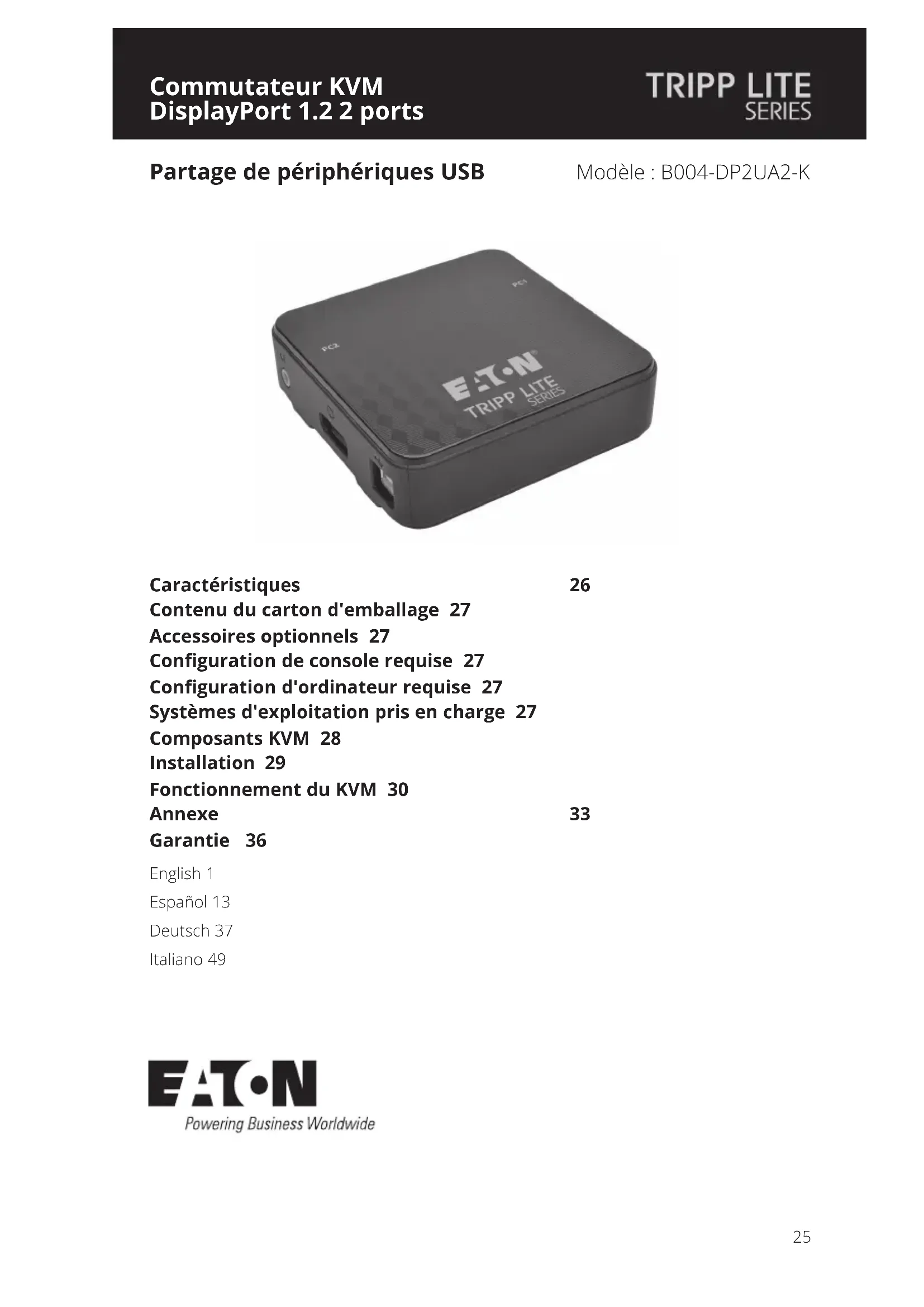 Garantie Eaton 1000 Eaton Boulevard Cleveland, OH 44122 États-Unis Eaton.com © 2024 Eaton Tous droits réservés. Publication n° 23-09-102 / 93-353A_RevD Février 2024 Eaton est une marque déposée. Toutes les marques commerciales appartiennent à leurs propriétaires respectifs. 93353A37 Eigenschaften 38 Inhalt des Pakets 39 Optionales Zubehör 39 Anforderungen an die Konsole 39 Computer-Anforderungen 39 Unterstützte Betriebssysteme 39 KVM-Komponenten 40 Installation 41 KVM-Betrieb 42 Anhang 45 Garantie 48 2-Port DisplayPort