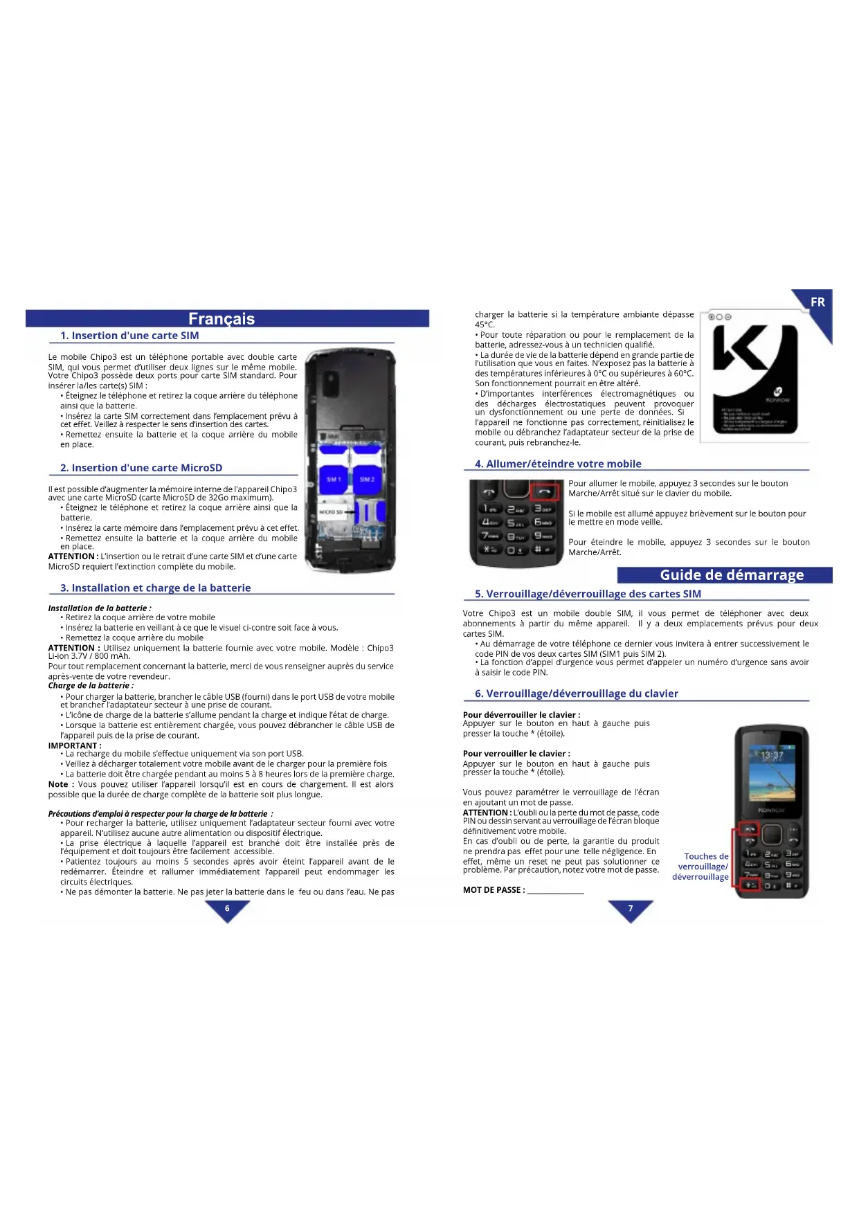 Your Chipo3 mobile is designed to not exceed the radio wave limits recommended by the European authorities. These limits include safety margins to ensure the protection of all persons regardless of their age or health. The SAR (specic absorption rate) of mobile phones quanties the maximum level of exposure of the user to electromagnetic waves for aural use. French legislation stipulates Ce produit est partiellement fondé sur le travail du JPEC Group. Bluetooth est une marque déposée de Bluetooth SIG, Inc. La technologie d’encodage audio MPEG Layer-3 et les brevets bénécient de la licence de Fraunhofer IIS et Thomson. CE PRODUIT EST SOUMIS À LA LICENCE MPEG4 PATENT PORTFOLIO LICENSE POUR UNE UTILISATION PERSONNELLE ET NON COMMERCIALE PAR UN CONSOMMATEUR POUR (i) ENCODER DES VIDÉOS CONFORMES À LA NORME MPEG4 (MPEG4 VIDEO ET/OU (ii) DÉCODER DES VIDÉOS MPEG4 VIDEO ENCODÉE PAR UN CONSOMMATEUR DANS LE CADRE D’UNE ACTIVITÉ PERSONNELLE ET NON COMMERCIALE ET/OU OBTENUES AUPRÈS D’UN FOURNISSEUR DE VIDÉO AUTORISÉ À FOURNIR DES VIDÉO MPEG4 VIDEO. AUCUNE AUTRE LICENCE N’EST ACCORDÉE OU IMPLICITE POUR UNE AUTRE UTILISATION. VOUS POUVEZ OBTENIR DES INFORMATIONS COMPLÉMENTAIRES AUPRÈS DE MPEG LA, L.L.C. REPORTEZ-VOUS À http://mpegla.com. Tous les autres noms de systèmes, de produits et de services sont des marques commerciales ou des marques déposées de leurs propriétaires respectifs. Les symboles ((TM)) ou (R) ne sont pas repris dans ce manuel. Recyclage Le symbole indiqué ici et sur l’appareil signie que l’appareil est classé comme un équipement électrique ou électronique et qu’il ne doit pas être mis au rebut avec d’autres déchets ménagers ou commerciaux en n de vie. La directive DEEE 2012/19/EU (directive relative aux déchets d’équipements électriques et électroniques) a été instaurée pour recycler les appareils à l’aide des techniques de récupération et de recyclage les plus performantes, an de minimiser les eets sur l’environnement, traiter les substances dangereuses et éviter les décharges de plus en plus nombreuses. Consignes de mise au rebut de l’appareil pour les utilisateurs privés : lorsque vous n’utilisez plus l’appareil, enlevez la batterie et mettez-la au rebut ainsi que l’appareil en respectant les processus de recyclage locaux. Pour de plus amples informations, contactez les autorités locales ou le revendeur de l’appareil. Consignes de mise au rebut de l’appareil pour les utilisateurs professionnels : les utilisateurs professionnels doivent contacter leurs fournisseurs, vérier les conditions générales du contrat d’achat et s’assurer que cet appareil n’est pas mélangé à d’autres déchets commerciaux lors de sa mise au rebut. En cas de problème : Contactez notre service après-vente depuis la page contact de notre site Internet : www.konrow.com Fabriqué en RPC 2017 Konrow En cas de problème irrésolu, veuillez contacter votre revendeur. Pour des raisons de sécurité seule notre station technique est habilitée à intervenir sur nos produits, dans cette optique nous ne fournissons aucune pièce détachée. La garantie fournisseur Konrow est valable pour un usage normal du produit tel qu’il est déni dans le cadre de la notice d’utilisation. Sont exclues de cette garantie, les détériorations dues à une cause étrangère à l’appareil. En particulier, la garantie ne s’applique pas si l’appareil a été endommagé à la suite d’un choc ou d’une chute, d’une fausse manœuvre, d’un branchement non conforme aux instructions mentionnées dans la English60 61 two at pins and a third round pin for the earth connection. The widest pin and the third pin constitute the important safety features designed to protect you. If you cannot manage to fully insert the plug into the wall outlet, contact your electrician to replace the obsolete wall socket.