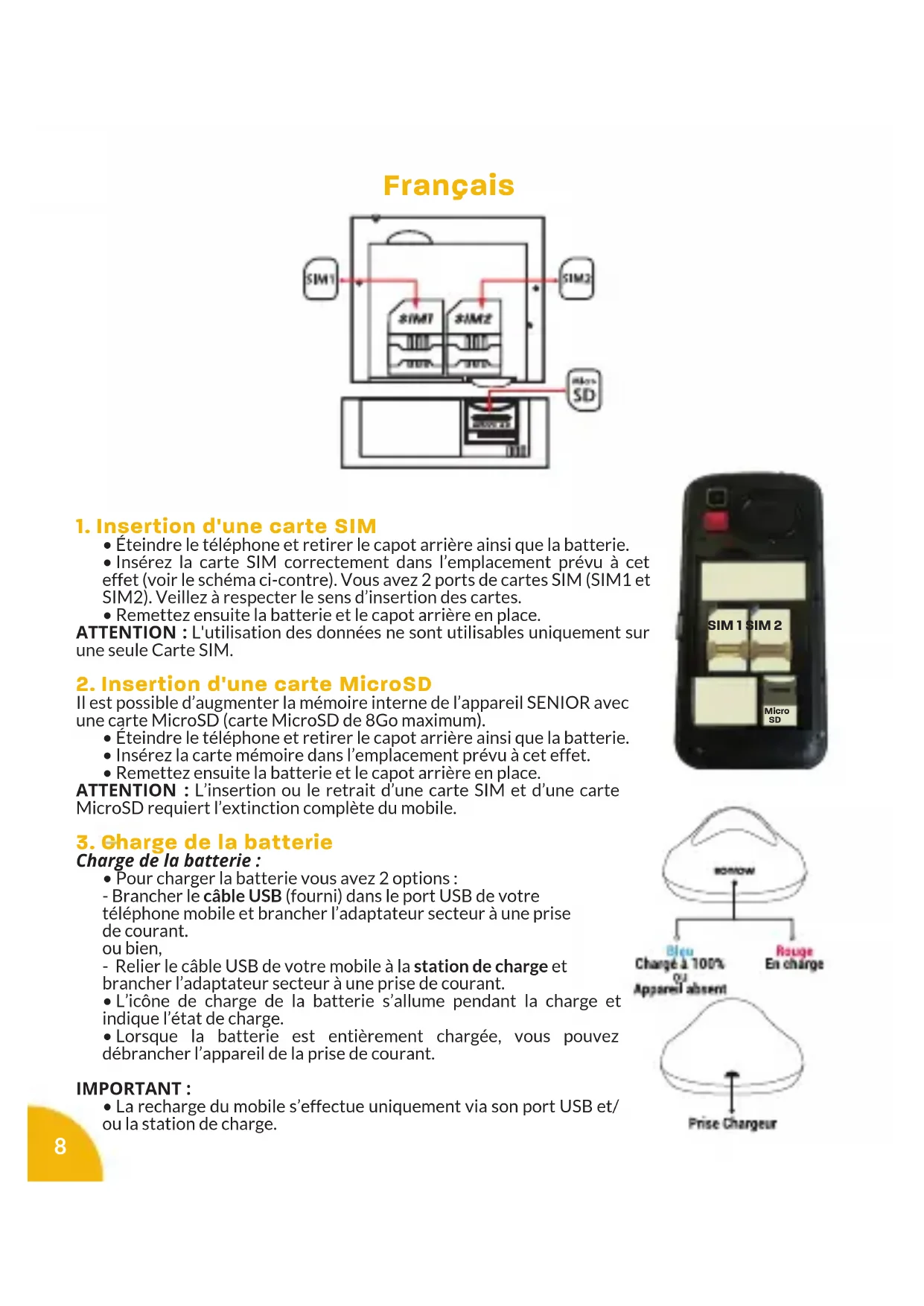 - La recharge du mobile s’effectue uniquement via son port USB et/ ou la station de charge. Français SIM 1 SIM 2 Micro SD9
