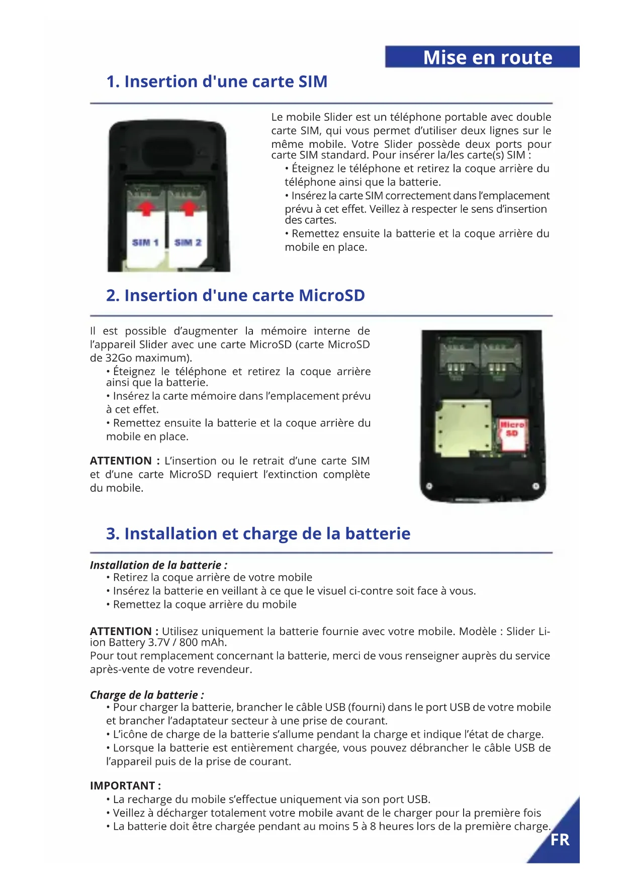 - Remettez ensuite la batterie et la coque arrière du mobile en place. Mise en route Il est possible d’augmenter la mémoire interne de l’appareil Slider avec une carte MicroSD (carte MicroSD de 32Go maximum).